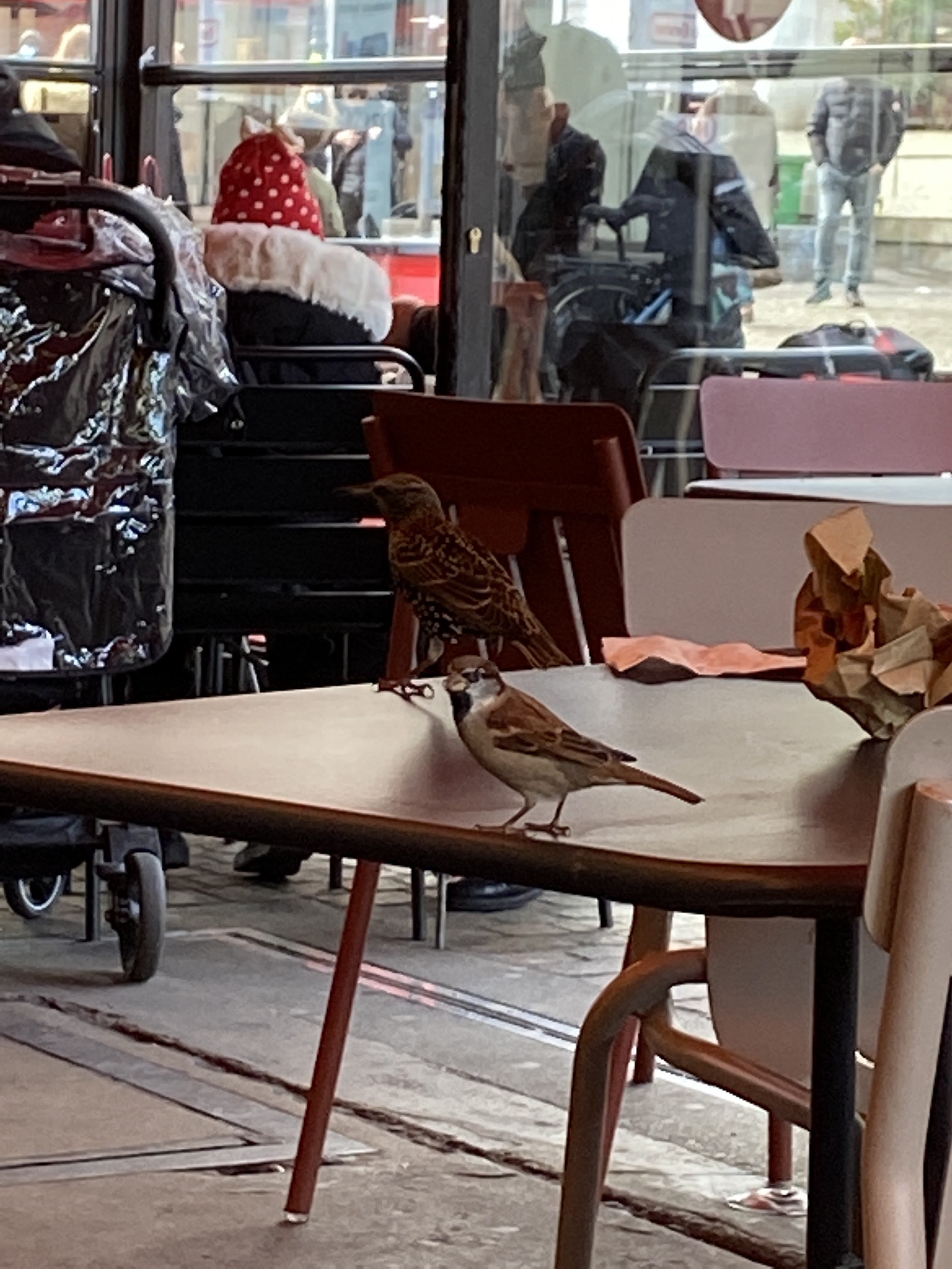 Un restaurant ou une volière à oiseaux ? Venez pour manger, reparter avec plusieurs suppléments fiantes sur vos vêtements. Les oiseaux déferlent au dessus de nos têtes. Un repas pénible et angoissant. Il faut faire quelque chose!