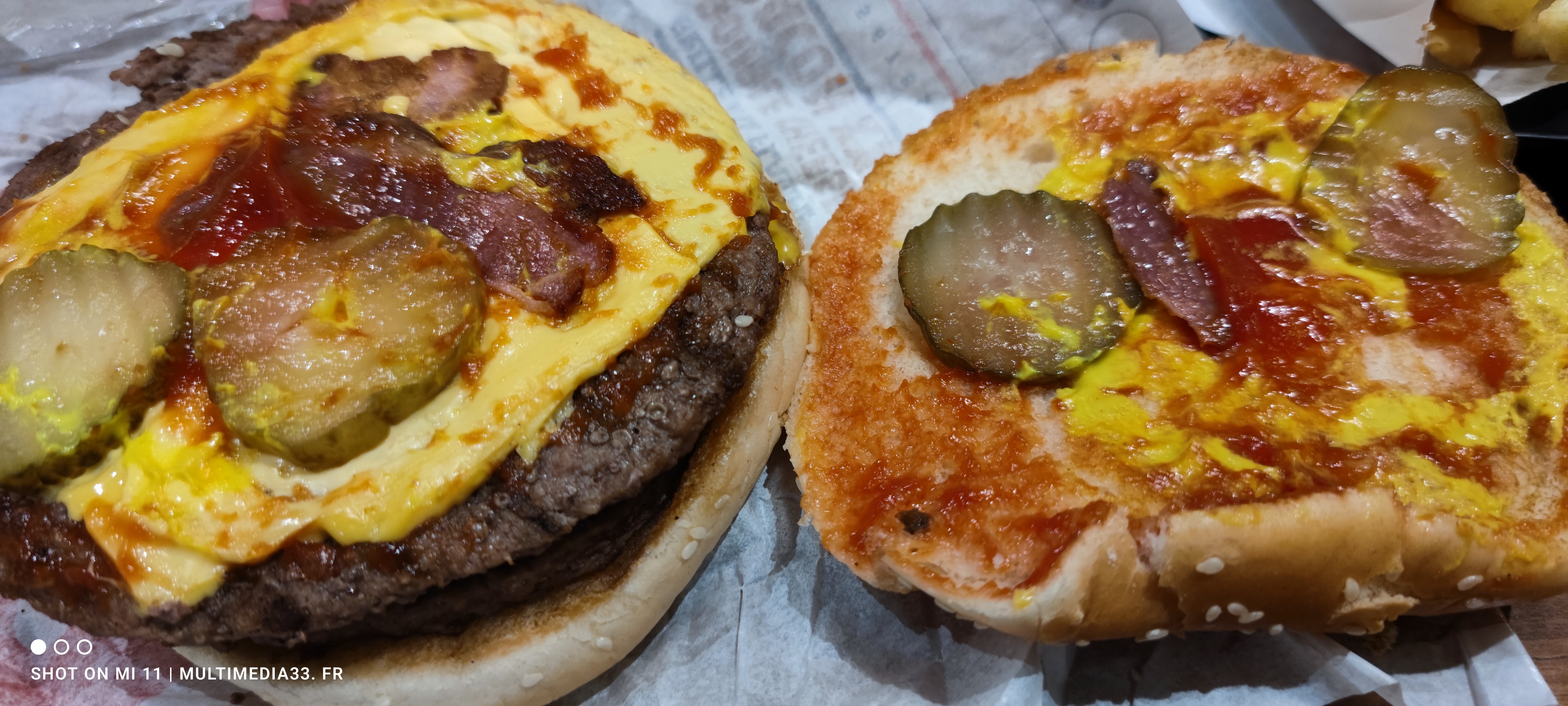 Personnellement, j'adore♥️ Burger King, mais là vous êtes limites.😡 - Commande faites à 21h08 servit 22 minutes🤔 plus tard pour 3 burgers et 2 glaces. 3/5 ( C'était loin d'être plein comparé à certaines villes mais bien plus propre, rapide). Dommage. - Propreté des lieux (table non relavé après passage de clients, voir collante, le sol et dans le même état au niveau des poubelles. Du jamais vu encore à ce point. - Les toilettes sont propres :4/5 dans l'ensemble mais gel hydro alcoolique vide. - J'ai vu un défibrillateur ce qui est très positif.👍 - Le double cheeseburger bacon les photos parlent d'elles-mêmes:2/5 . 2 malheureux bout de bacon, dauce quasi inexistante. - Le wooper de mon fils était excellent😋 5/5 avec une sauce généreuse contrairement à celui de ma femme qui avait prit un burger poivre mais dont elle cherchait la sauce. Les frites très chaudes🔥, parfait.🙂 c'est dommage , soyez un peu plus généreux dans les quantités et nettoyer plus régulièrement serait bien pour l'hygiène. Si vous ne le faites pas pour vous, faites le pour vos clients.