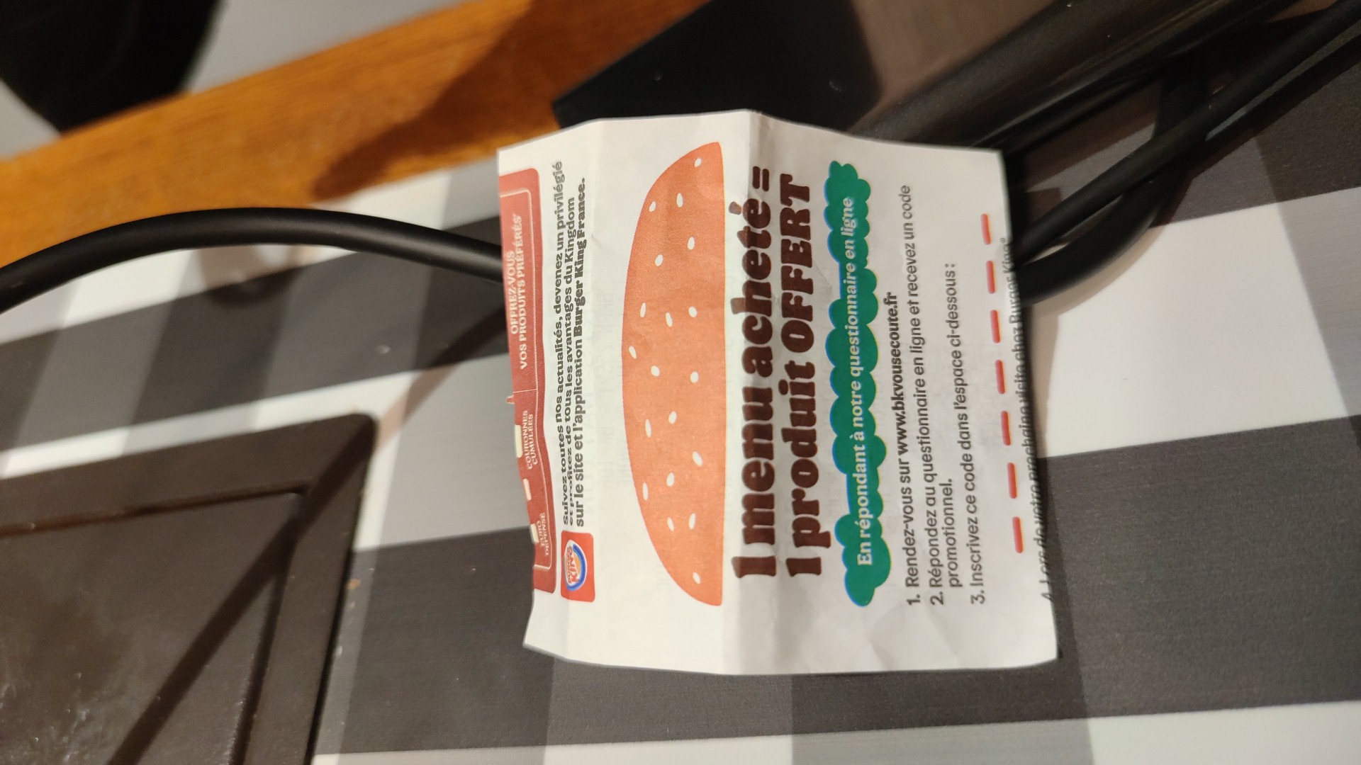Je suis venu avec un ticket d'un menu acheté quelques jours avant et j'ai donné mon avis pour avoir le produit cependant à la caisse on me dit que j'ai commandé à la borne donc ça ne fonctionne pas. Quelle déception ! Je n'ai pas pu avoir mon produit offert à cause de ça !