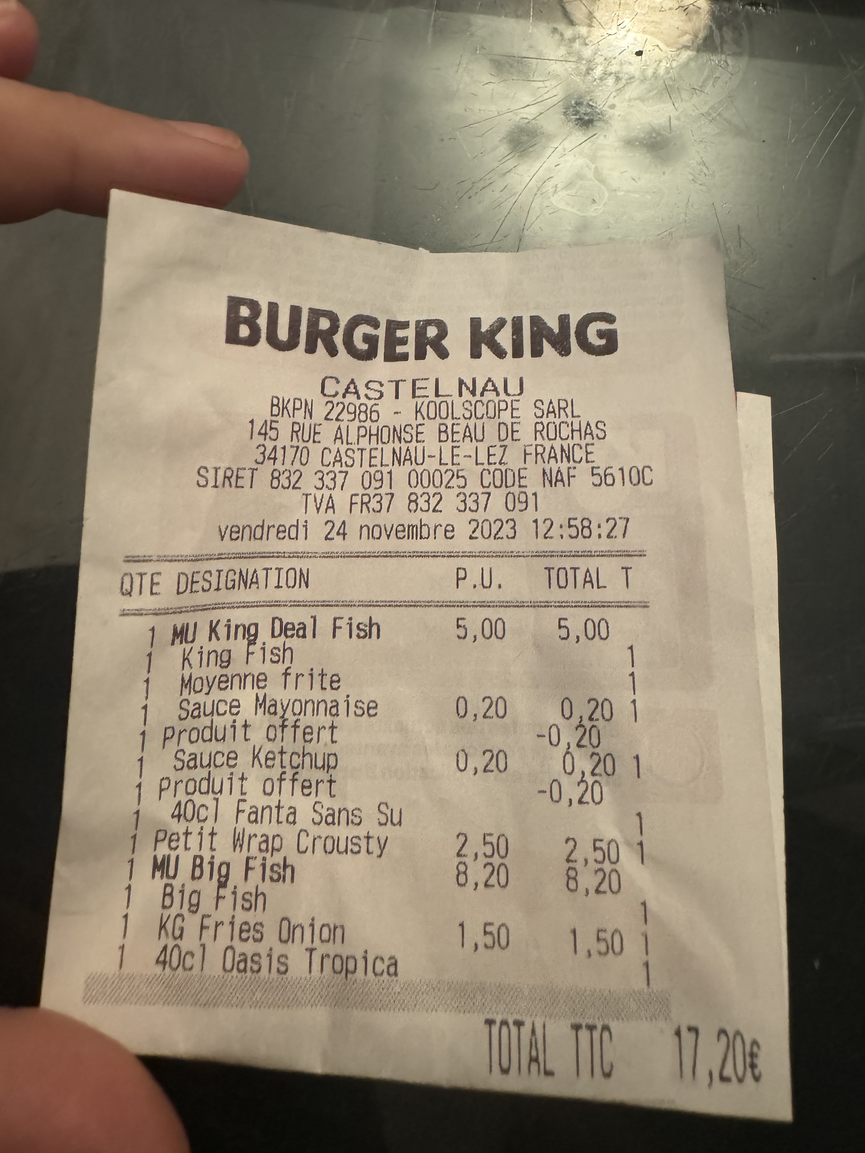 Bonjour, bonsoir J’ai commandé un King deal poissons à emporté et le pain était endommagé avec une forte odeur de poussière je vous laisse voir de vous même, je mets néanmoins 2 étoiles car le personnel était agréable