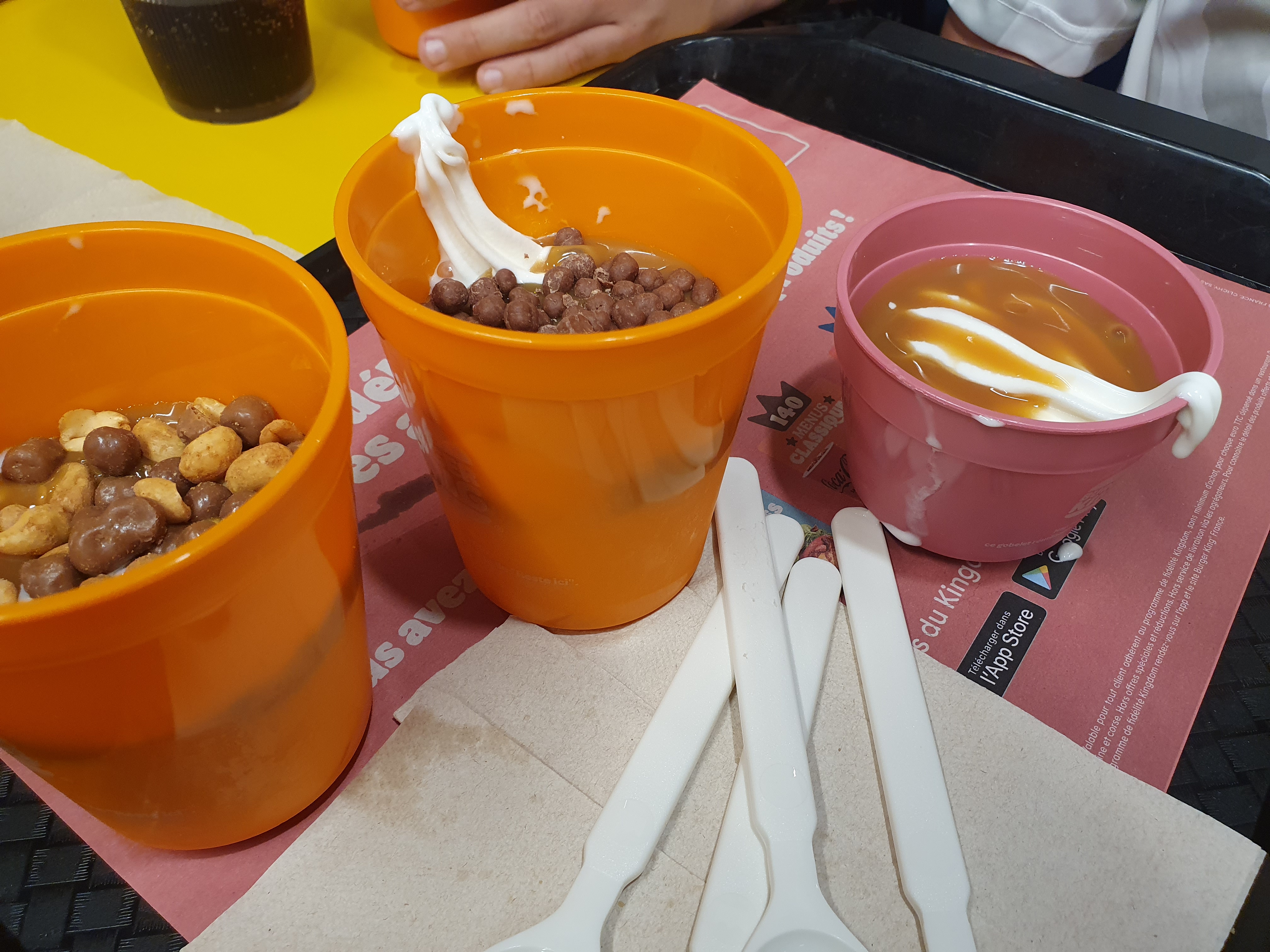 4 glaces commandees sur place, recue en quantite echantillonaire , j ai deja pris des king fusion dans d autre B K qui etaient au moins 2 fois plus genereuses. Le serveur a juste trouve a dire que c est la photo des desserts sur la borne qui est exageree Excusez moi de vous avoir derange en ce Dimanche apres midi. Restaurant a fuir !