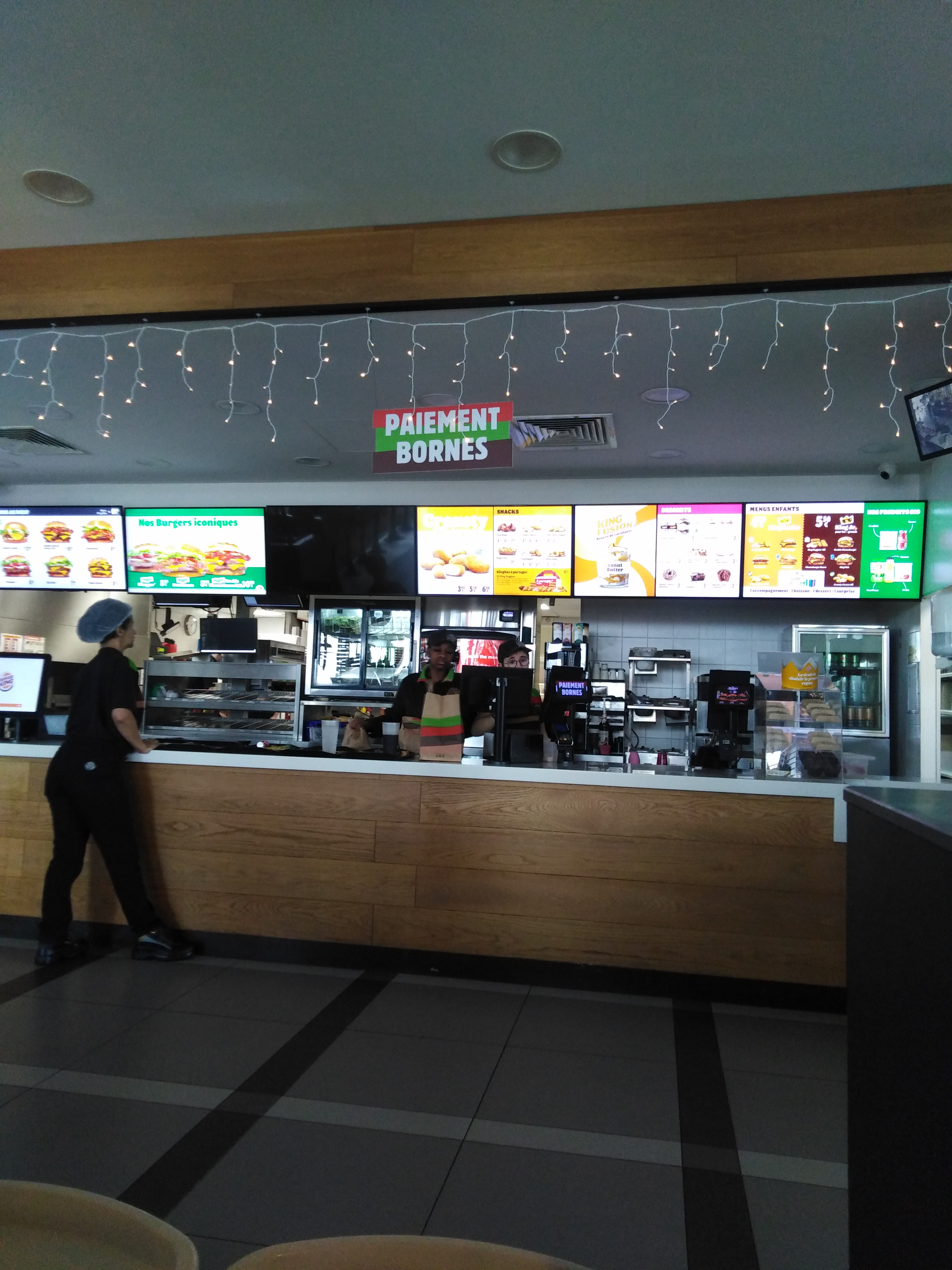 C’est un Burger King donc rien de spécial par rapport à la cuisine, mais par contre il faudrait employer des personnes un peu plus aimables et aussi avec une bonne audition surtout quand ils sont à la borne.