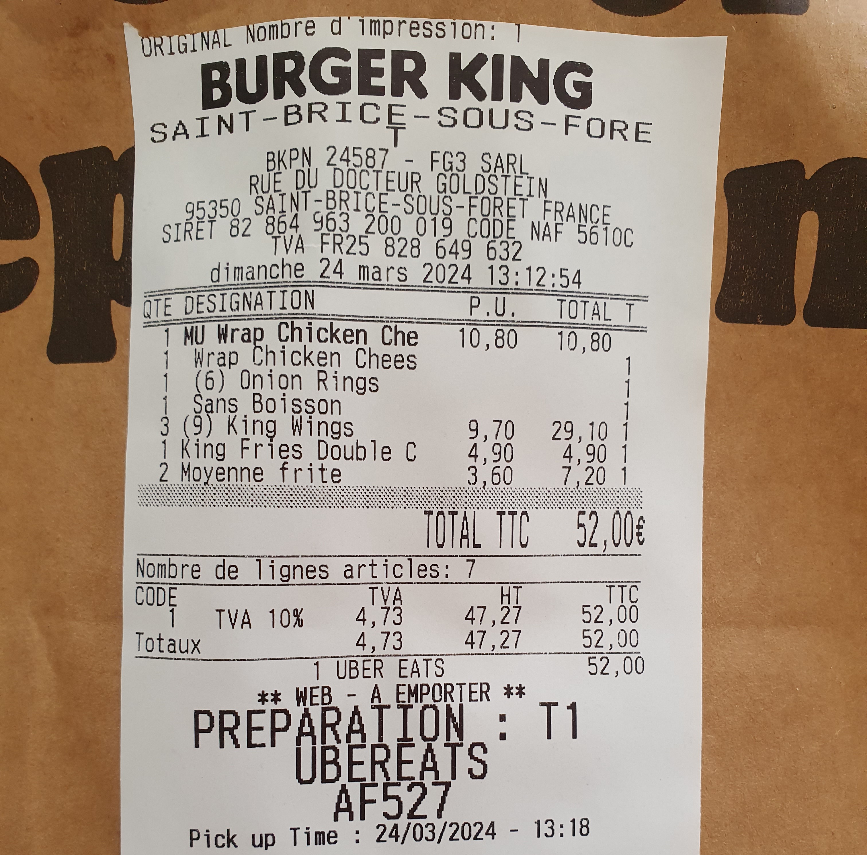 Préparation T1 ubereats AF527 du 24 mars 2024. il manque les 2 frites... pourtant précisées sur votre impression collée sur votre sac.