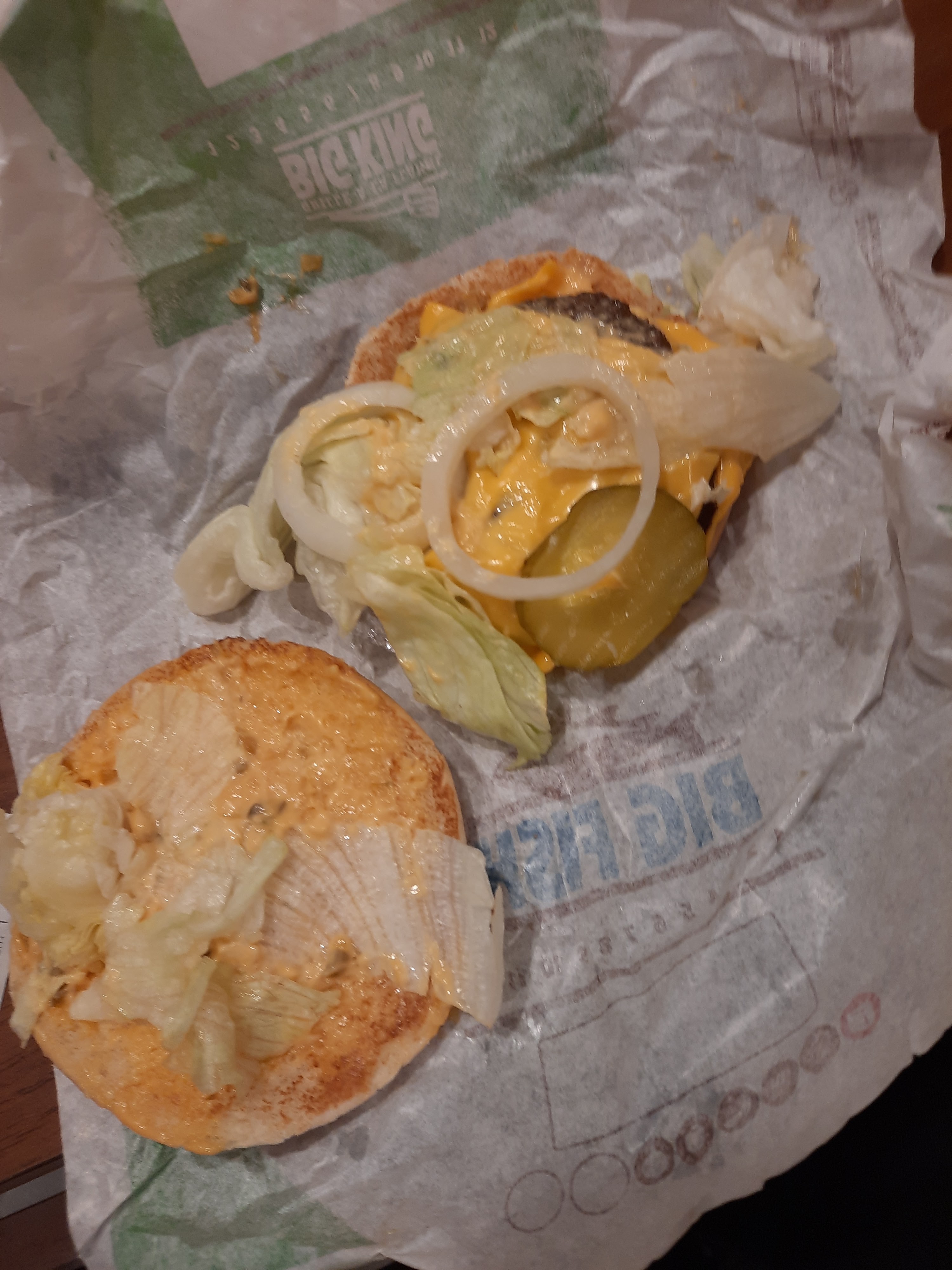 Une catastrophe Commande passée à 14h14 servie à 14h42 Tout est froid même les frites, le bacon pas cuit, le cheddar je préfère même pas en parler… si vous avez le choix dans le secteur ce Burger King est franchement à éviter bref … la photo c’est à la fin c’était immangeable !