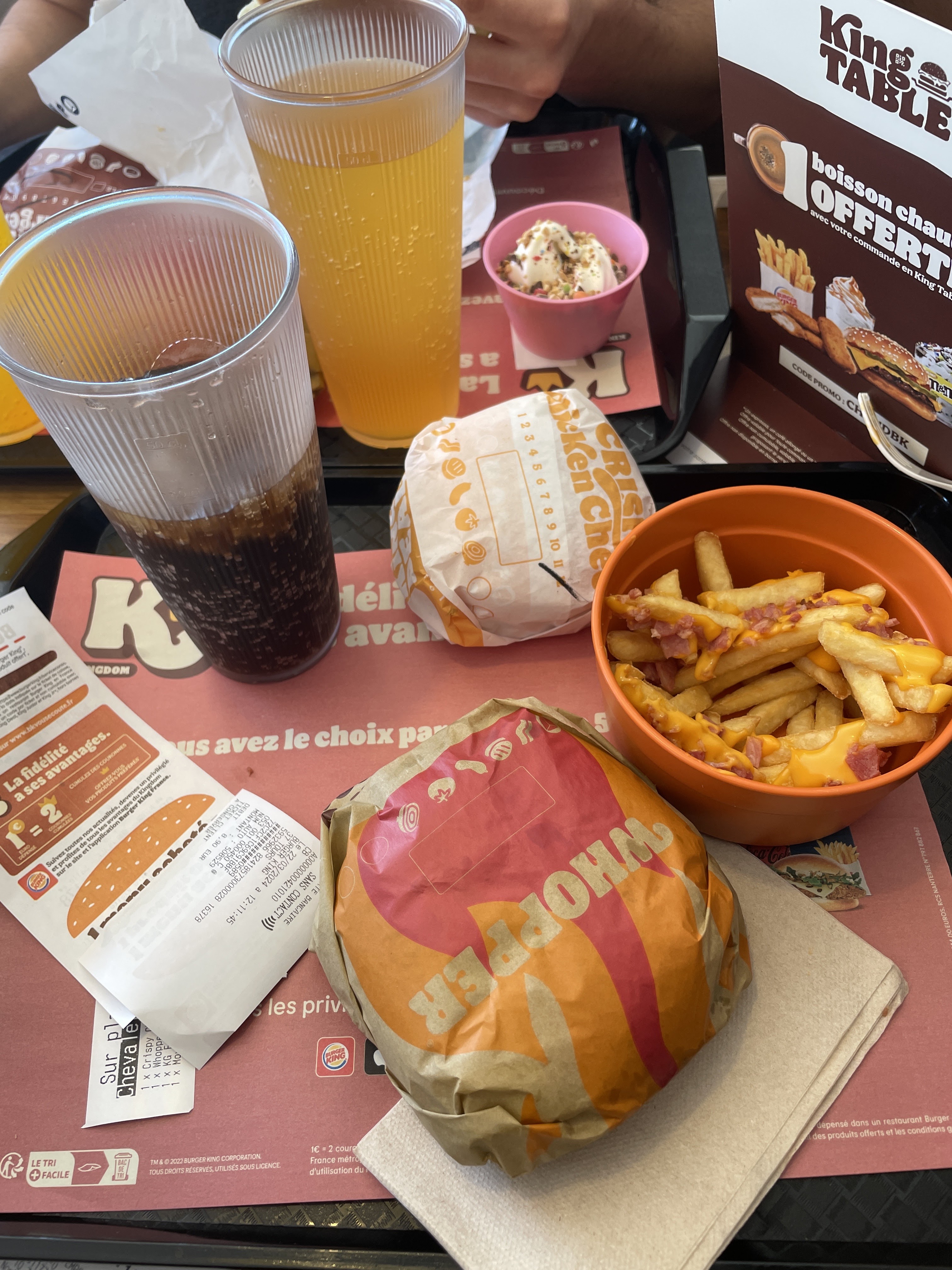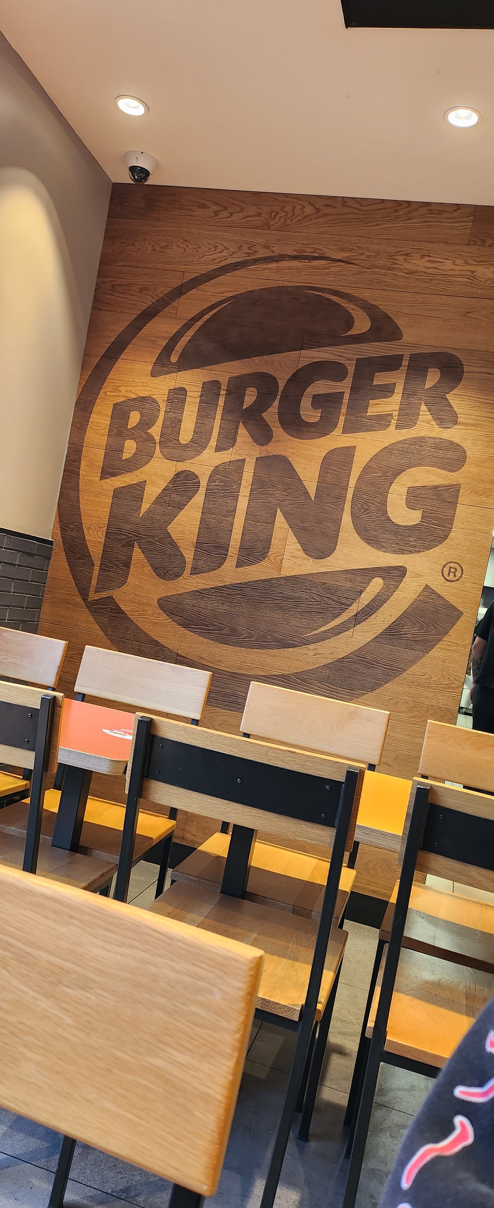 Burger king est sympa, belle déco ,salle spacieuse, il manque un peu plus de boisson froides ,et chaudes et fait maison serait mieux par une machines ,vrai lait et café etcc, sinon produits toujours trop caloriques ,manque de bio, une fois de temps en temps,prix sur les boissons froides ou chaudes un peu excessif,on peut avoir la même chose en hyper moins chère, je recommande par si par la pour garder la santé.