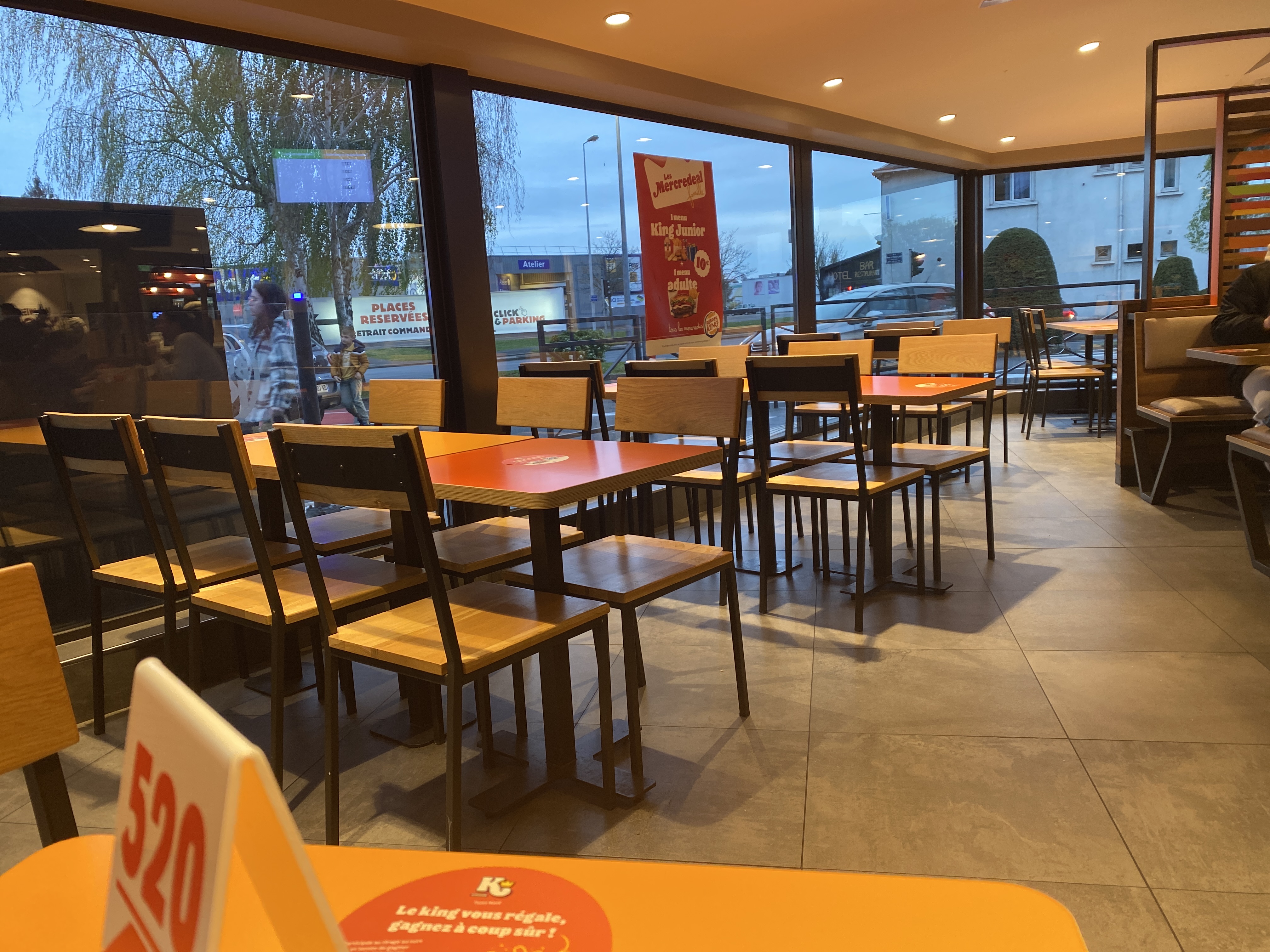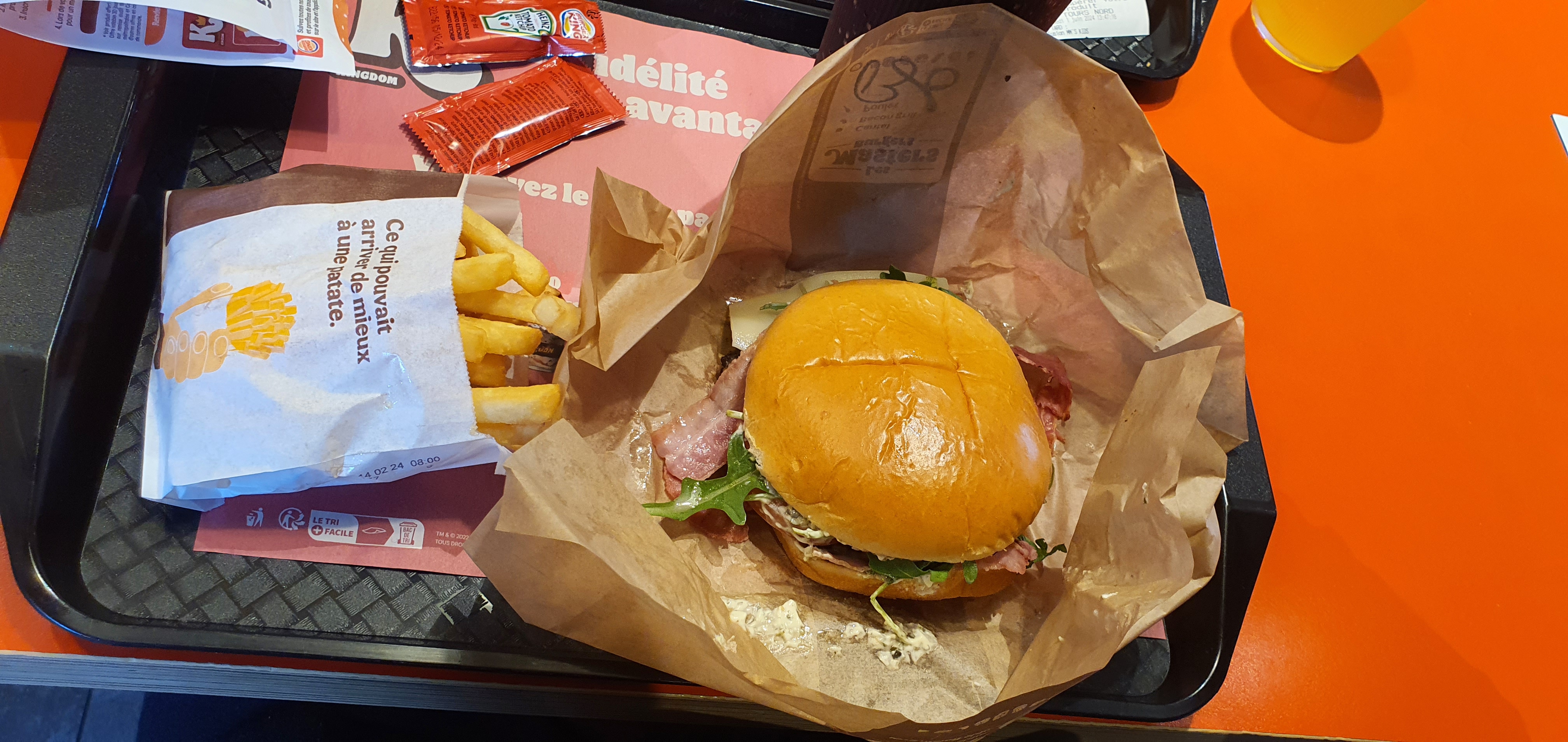 Très peu de monde au BK de Tours Nord mais pourtant pas mal d'attente, le Cantal au Poulet était pas mal ( à 13e le sandwich; encore heureux ! ) mais par contre mon Steackhouse était tout simplement ignoble Le bacon? Horrible Les steacks hachés j'en parle même pas Sincèrement j'ai manger 3 crocs et j'ai vite mis ça à la poubelle. Plus le temps avance et plus les BK deviennent de moins en moins bon. 1ere et dernière expérience dans ce BK, je vais pas faire de drama, mais mon mal de ventre de cet après midi, c'est peut être bien de votre faute 🤷♂️