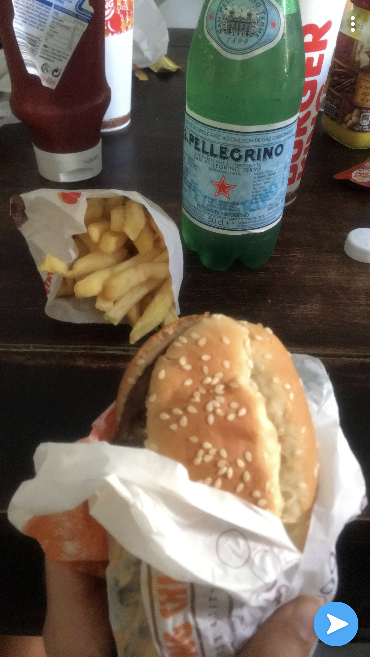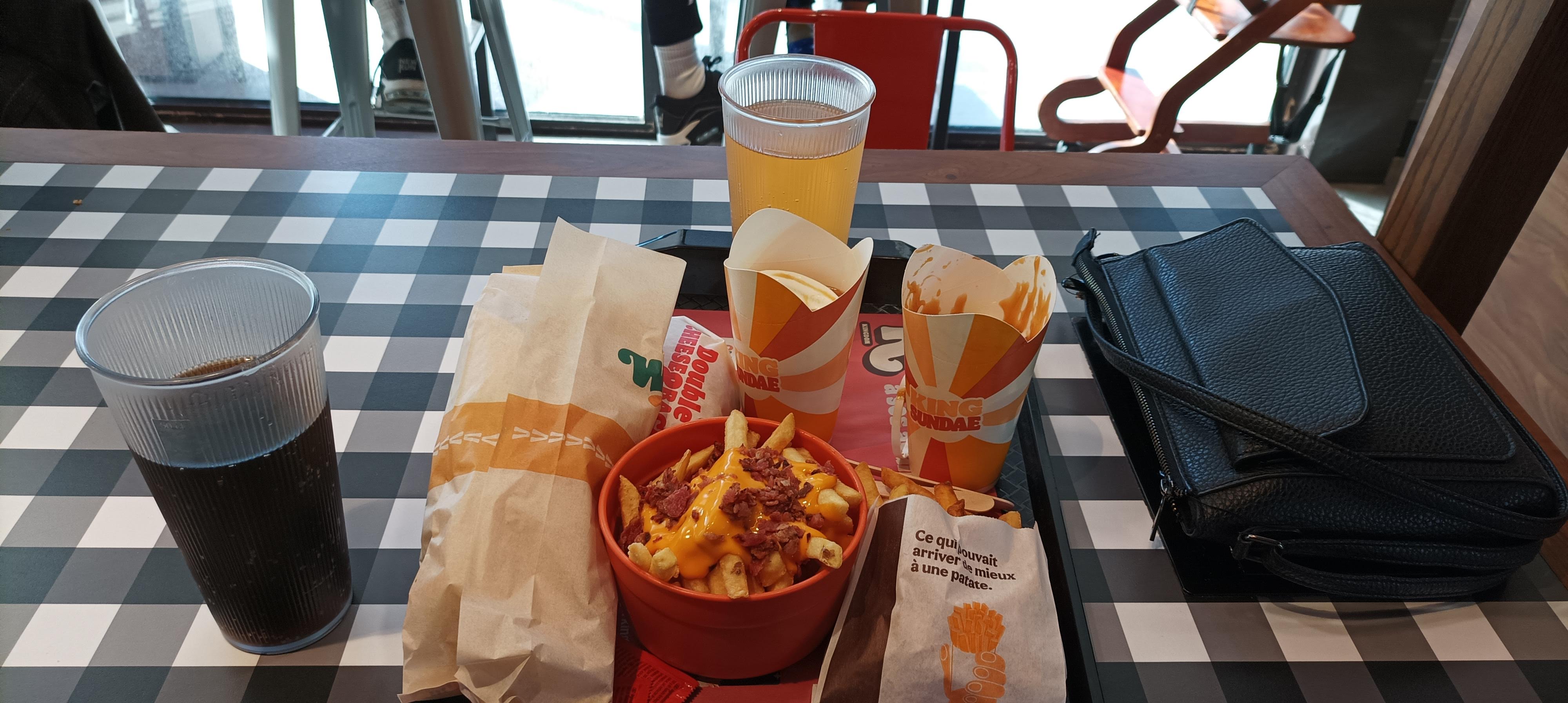 Extrêmement déçue. Première fois que je découvre BURGER KING. Nous avons commandé un BIG KING en menu + 1 moyen Fanta et 1 moyenne frites.. Choquée par la taille de la moyenne frites qui ressemble plutôt à une petite frites... Le burger était vraiment petit, mais bon. Je ne renouvellerai pas l'expérience. Je trouve cela cher pour la quantité obtenue.