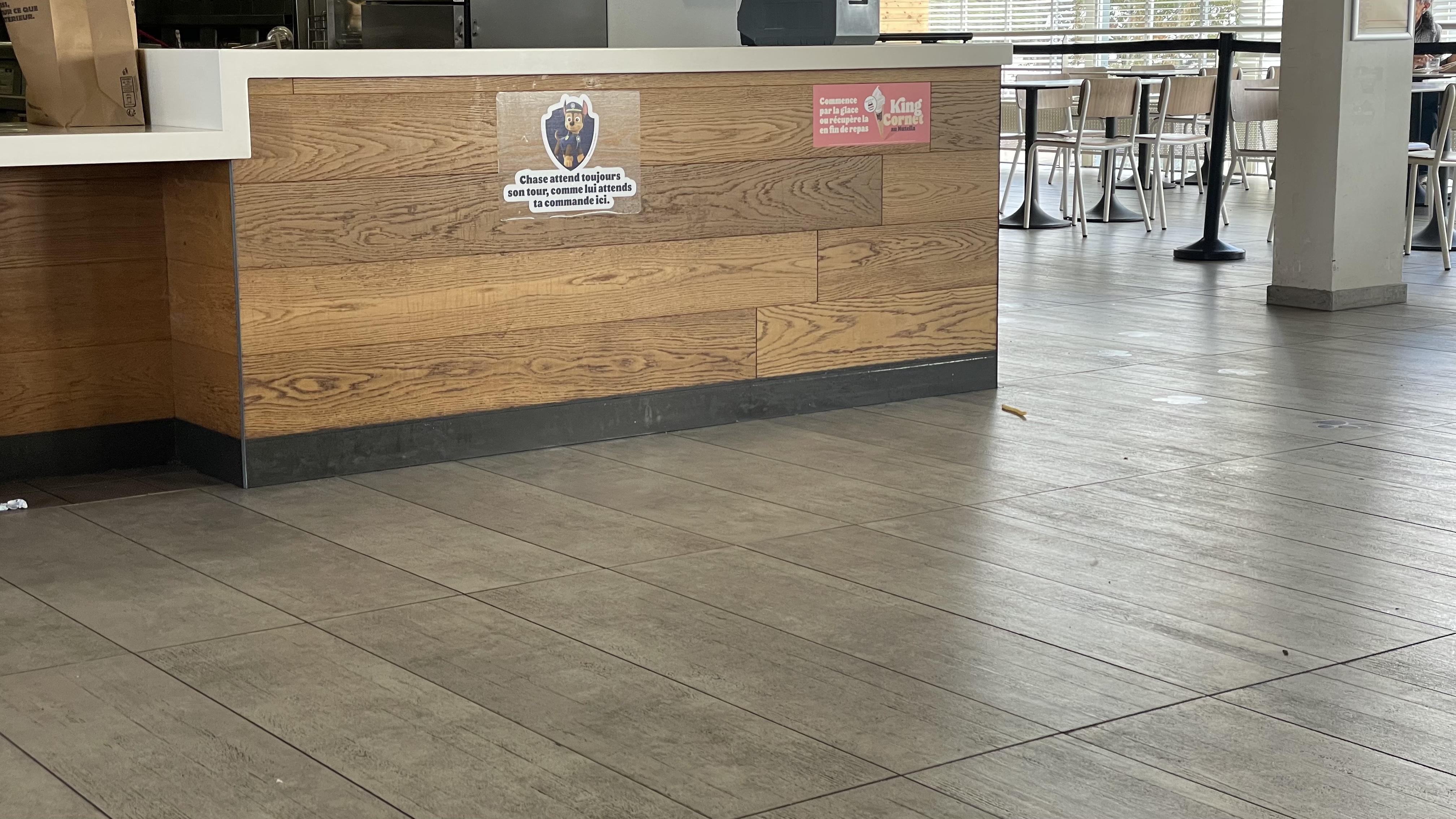 Pas même un bonjour, table pas nettoyer et sol collant. Pas trop d’attente par contre même si il ne font plus de paille donc beaucoup moins pratiques pour boire les milkshakes qui eux sont bien en vente par contre. Dans les toilettes les panneaux tiennent avec des rizlan et tout est défoncer c’est pitoyable.