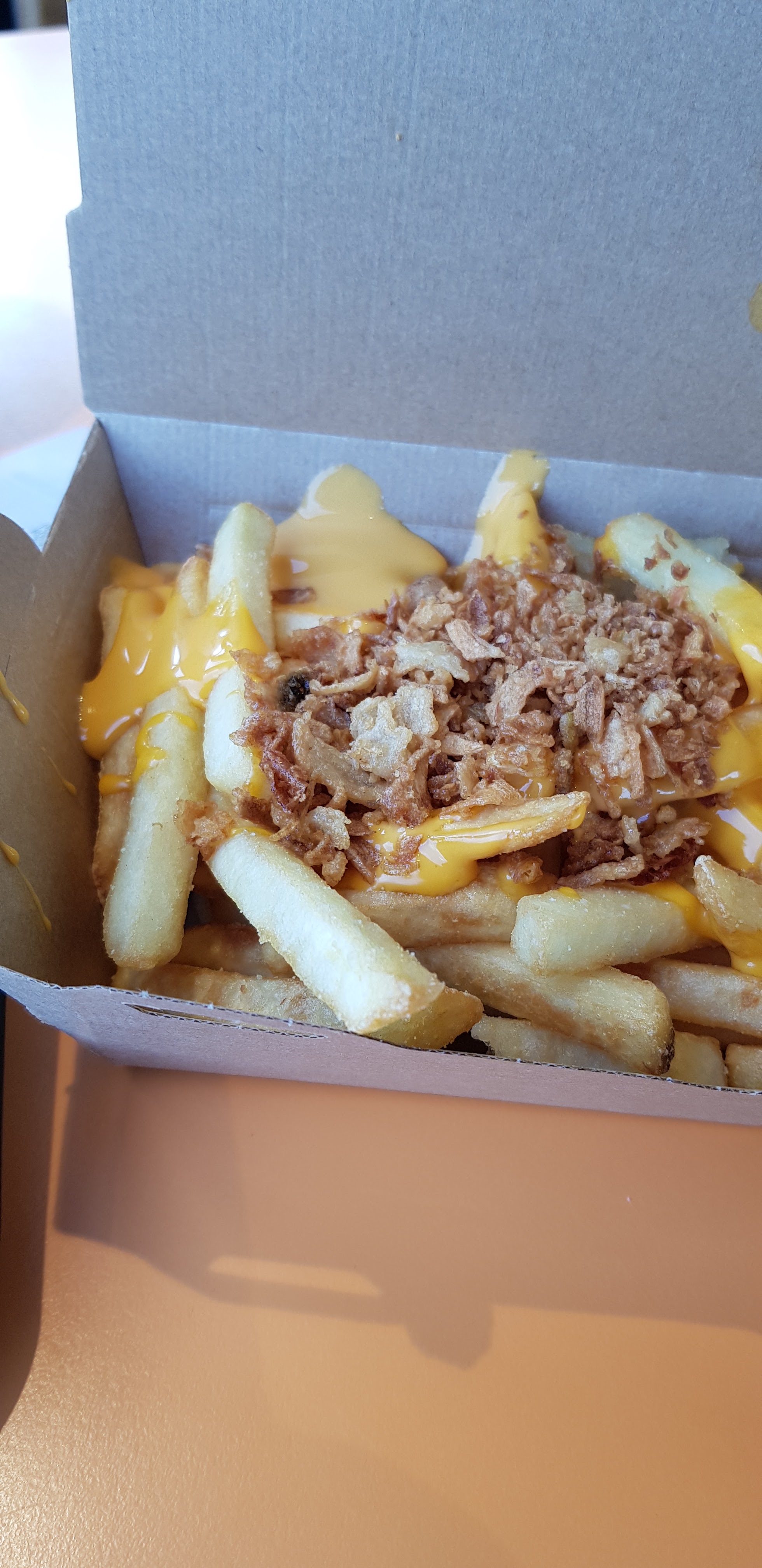 Service déplorable aujourd’hui. J’ai dû attendre un temps fou seulement pour que ma commande soit prise. En plus de ça, le service était long. Au final, j’avais commandé des frites avec cheddar et oignons frits avec mon menu. Où sont-il ? Au prix du menu c’est honteux.