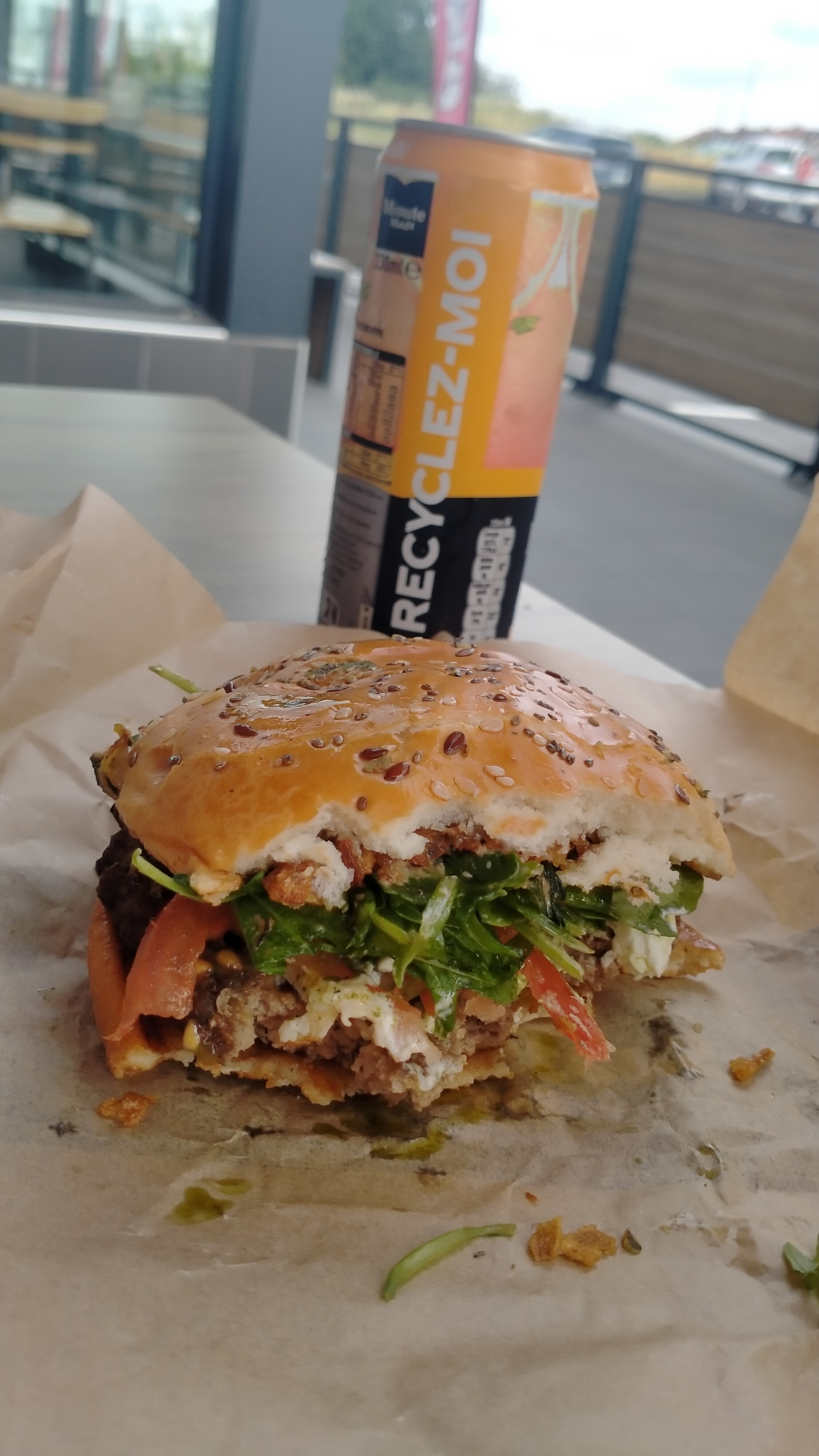 Pour le repas : ma salade très bonne ! Le burger de mon mari froid ! Pas de couverts ni serviette , aucune sauce . La serveuse renverse tout le coca sur moi elle s’excuse mais on ne vient pas ramasser sur le sol ! Et on ne fait pas un geste !! De plus , cette porte qui grince s’est insupportable !!! Un peu d’huile le tour est joué ! Dommage car ça pourrait être bien ! Déçue de mon passage .