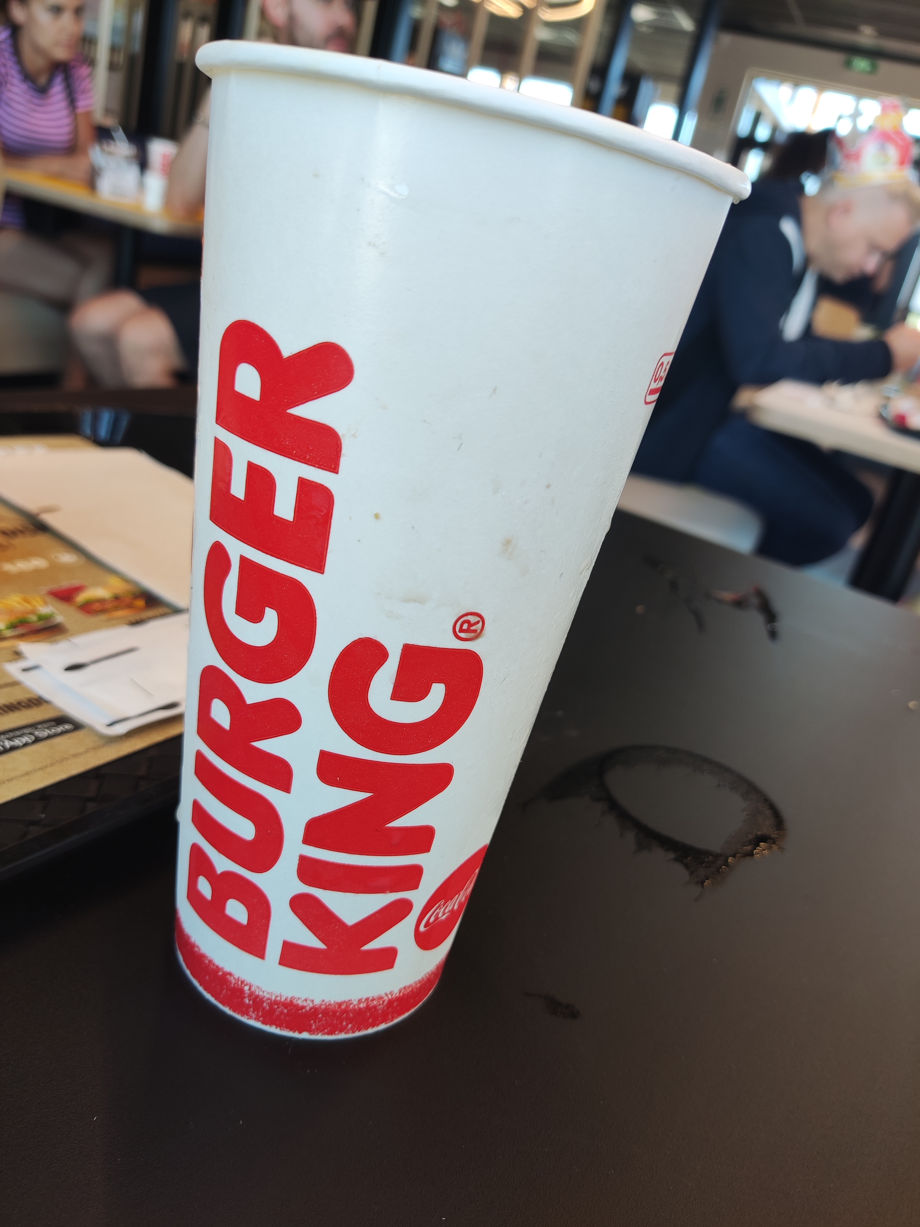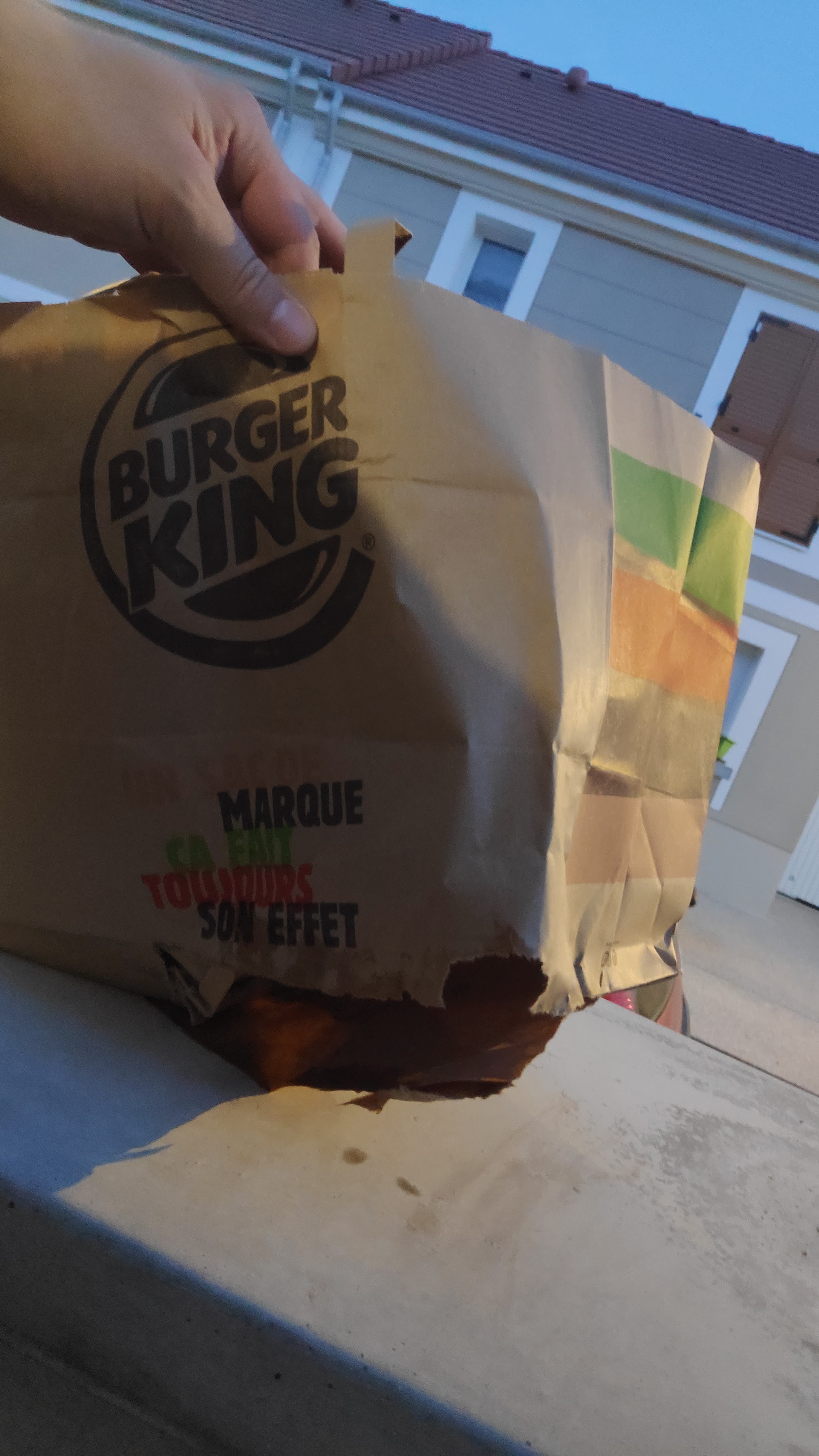 Toujours efficace ce Burger King, par contre je suis passé hier et je n'en peux plus de ces boissons mal fermées, voilà ce qu'il s'est passé après 5min de voiture pour rentrer, le sac a craqué par en dessous et j'ai perdu mes deux boissons en sortant de la voiture, et ce n'est pas la première fois c'est quasiment tout le temps, je peux vous dire qu'on était dégoutés avec ma compagne...