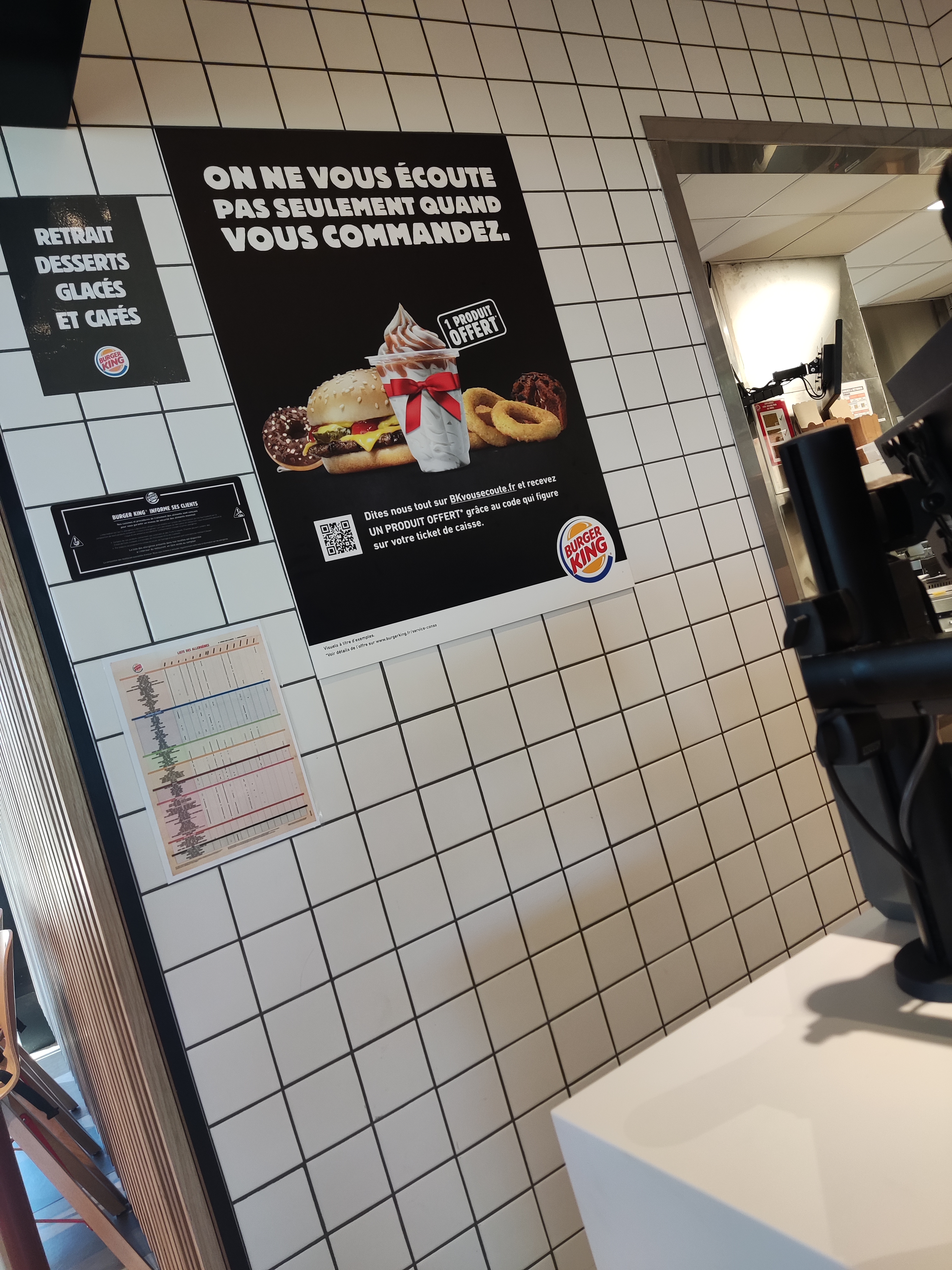 Ce restaurant refuse de prendre le ticket pour un produit offert lorsque l'on répond au questionnaire de bkvousecoute car il vient d'un autre restaurant ( aucun indication de cela sur le ticket publicitaire). La responsable n'a pas besoin de client car on a tort et se moque des commentaires . Pas d'utilisation de vaisselle réutilisable. Mauvais goût du coca zéro. Le pain du burger était sec.