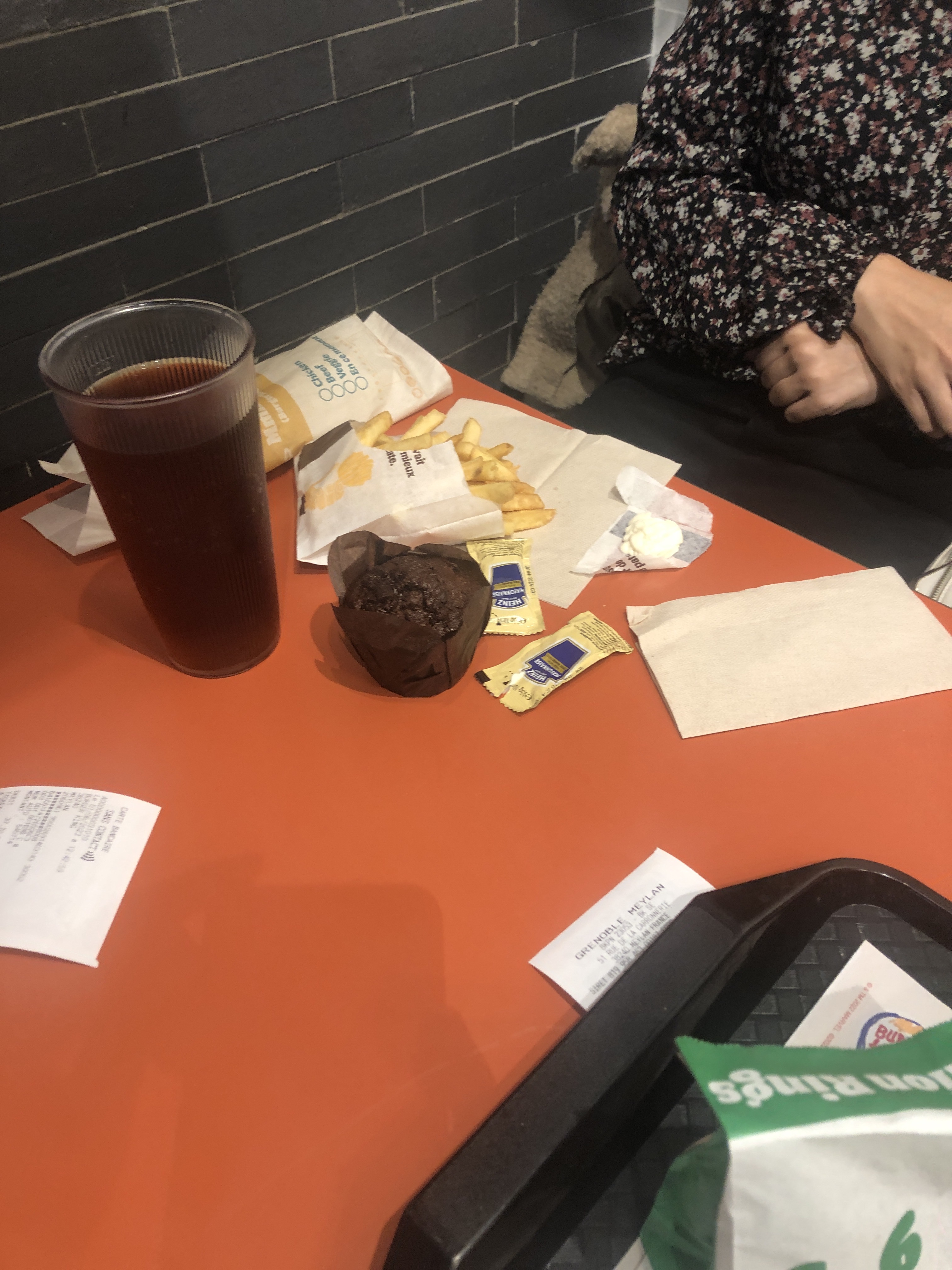 J'avais envie de manger un burger et ça faisait un bail que je ne m'étais pas arrêté dans ce genre d'établissement alors que j'en avais un bon souvenir ! Et là, je suis même allé au comptoir pensant qu'ils s'étaient trompés de sandwich mais non la tranche de lard était bien écrasée dans la mousse, pardon, le pain ! Et ce devait être un format enfant... Le muffin était encore froid du coup, pas cuit...le truc te colle aux dents et manque de t'étouffer !