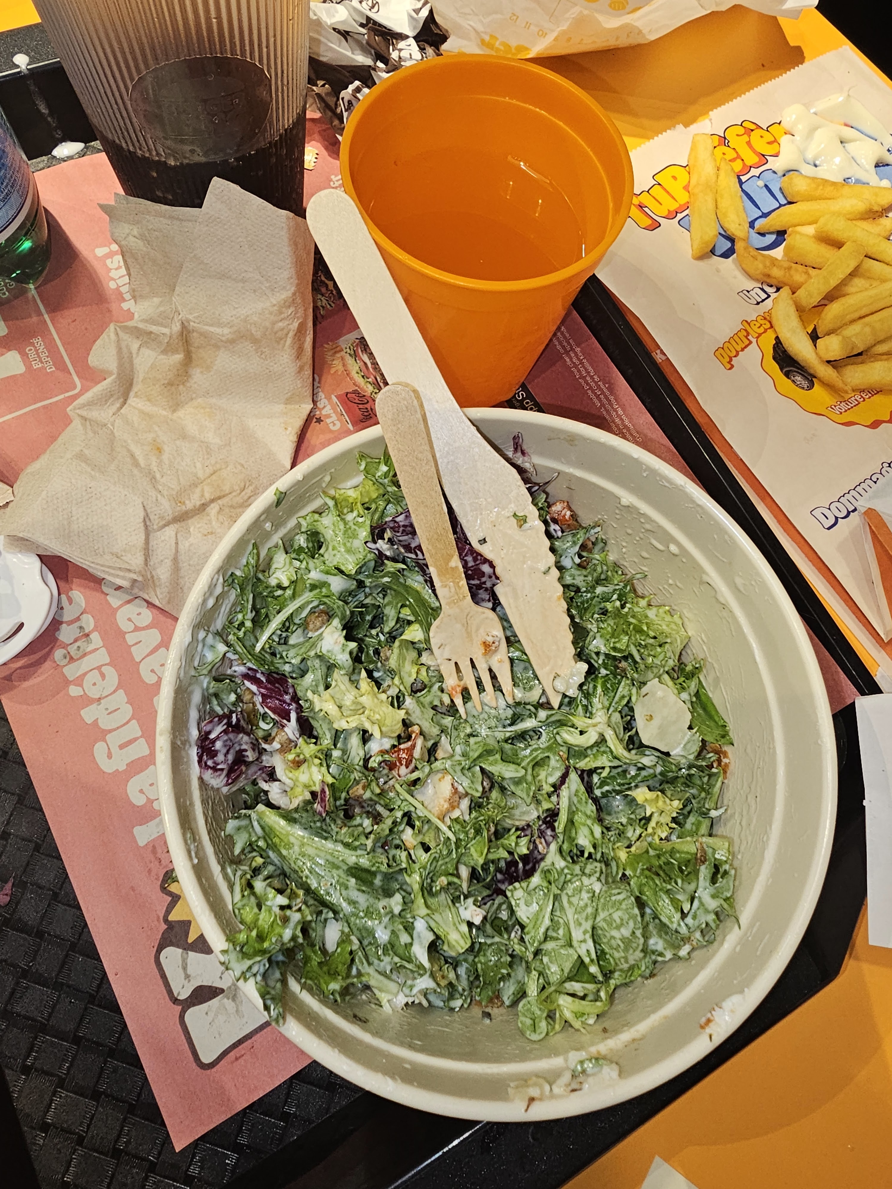 Depuis plusieurs fois je remarque une attente et une fois de plus même hors commande en drive c'est encore très long de plus je commande une salade et je me retrouve avec des couvert de dînette au vue du prix il pourrais au moins surveiller leur stock, j'espère qu'il pourront remonter la barre, bon courage!!
