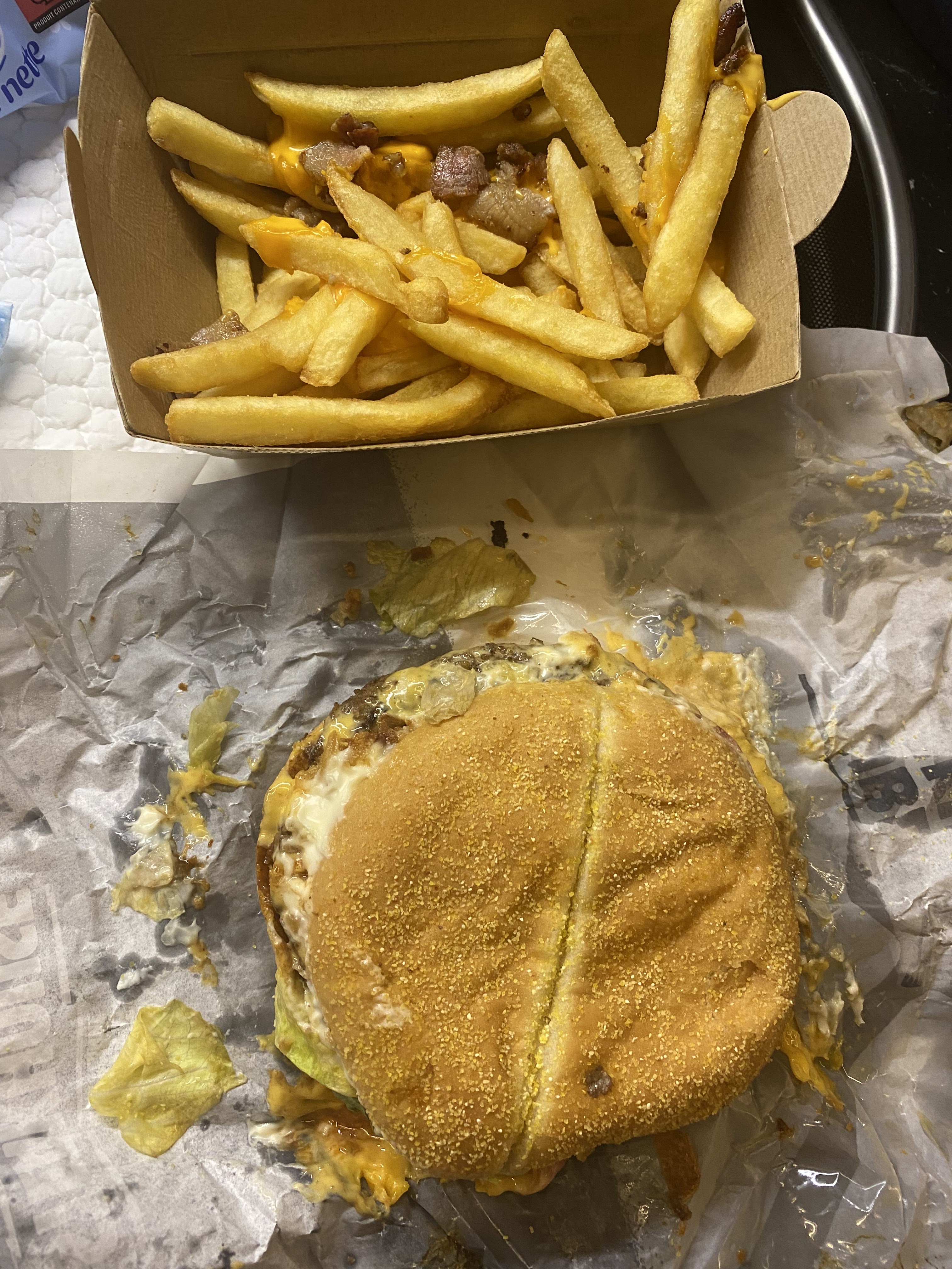 Commandé un Big King XXL avec supplément cheddar et viande, reçu un Big King XXL avec un steak, sans oignons, avec une sauce piquante et mes Chili Cheese dedans alors que je les ai commandé a part et j’ai reçu un paquet de nuggets alors que c’était pas commandé, bref, et un burger au poulet sorti de je ne sais où. Pris à emporter, pas vérifié plus que ça car j’étais pressé, tant pis, mais la préparation de commande est complètement à côté de la plaque. Il y a une enseigne avec un M jaune juste en bas, le prochain coup j’irai voir Ronald … (Commande 698 du 21/03/2024 à 21h58. Vous pouvez vérifier…)