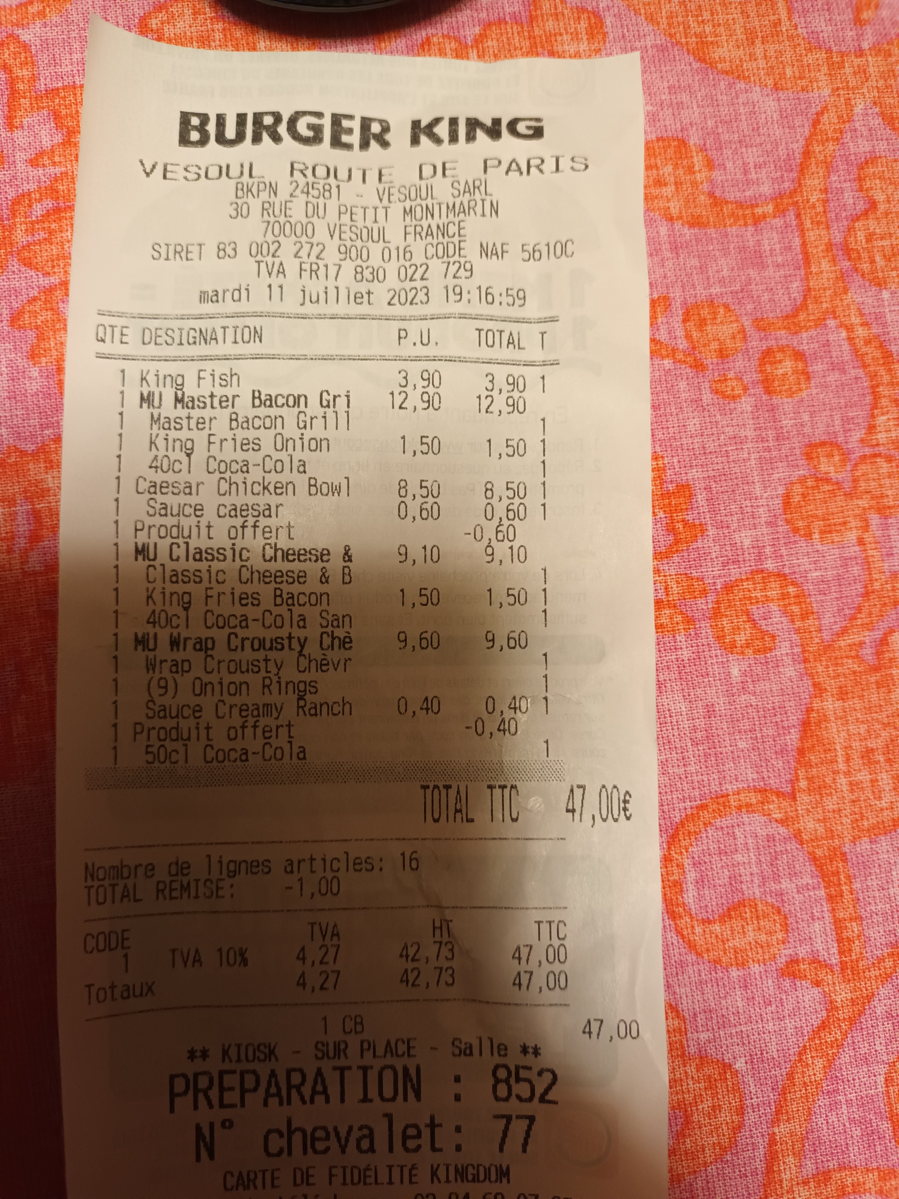 Première fois pour moi que j’écris un commentaire mais la je suis vraiment très déçu et en colère contre Burger King Vesoul !!! Je commande un menu avec des suppléments que je paye bien sur.. En arrivant à la maison, au moment de déballer mon burger... SURPRISE !! C'est un simple burger sans aucun supplément, ce n'ai pas la première fois que cela m'arrive et ne parlons pas de la quantité de frite...