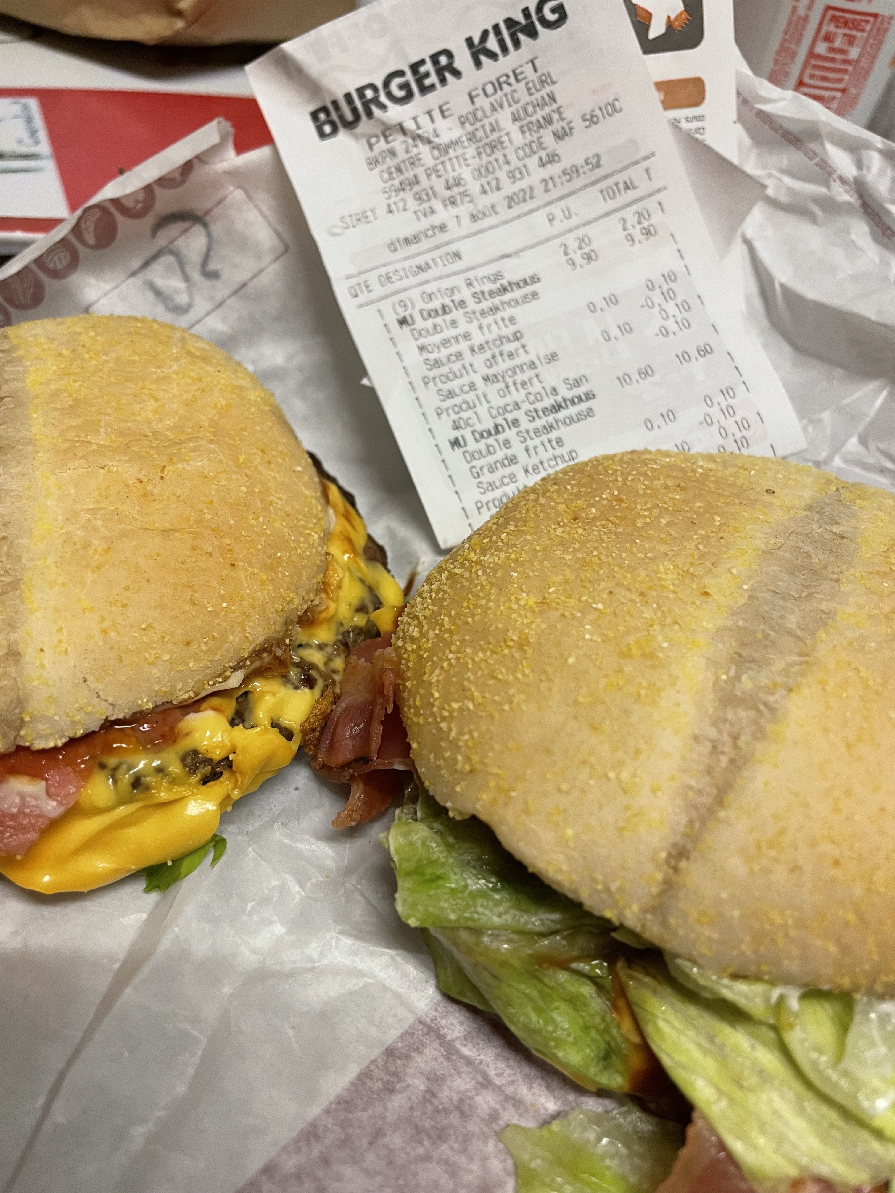 A éviter ! Commande au drive. Il manquait le menu Junior, j’y suis donc retournée pour réclamer. Arrivée à la maison, alors que nous avions commandé 1 Bing King 1 Double Whopper Cheese sans oignon, 1 Double Whopper Cheese supp cornichons et 1 petit Wrap poulet, nous avons finalement eu 3 doubles Whopper Cheese sans oignons, et 1 Wrap chèvre …