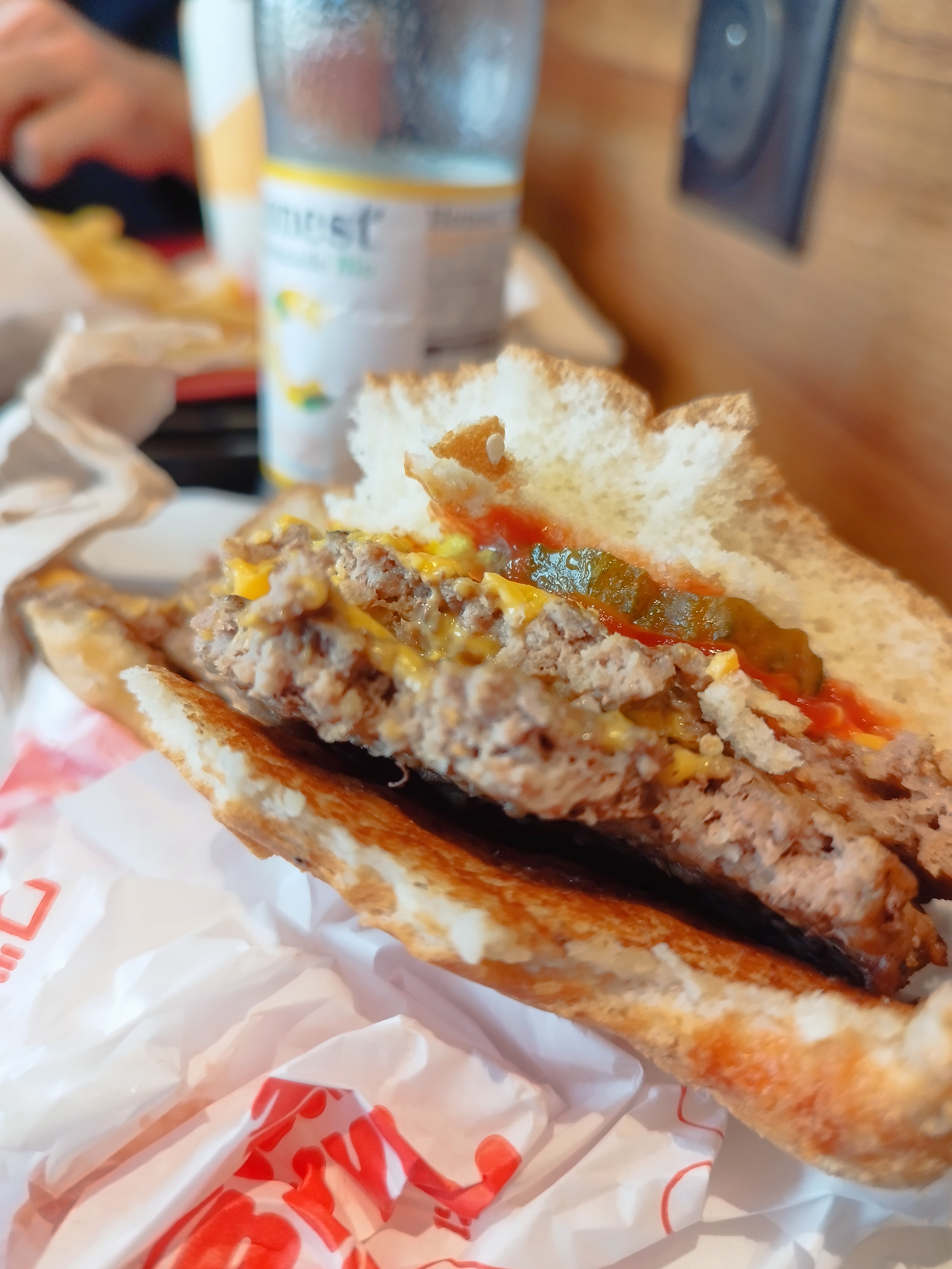 Sur deux burgers, il n’y en a qu’un qui était le bon commandé, et le coca est clairement de la flotte. Il y a eu un gros problème. La glace à peine donnée était déjà de l’eau qui coulait partout dans le sac. L’ambiance est sympa (drive) le serveur est rigolo mais j’apprécierais plus de manger les produits commandés plutôt que de rire, l’idéal étant de combiner les deux 😌