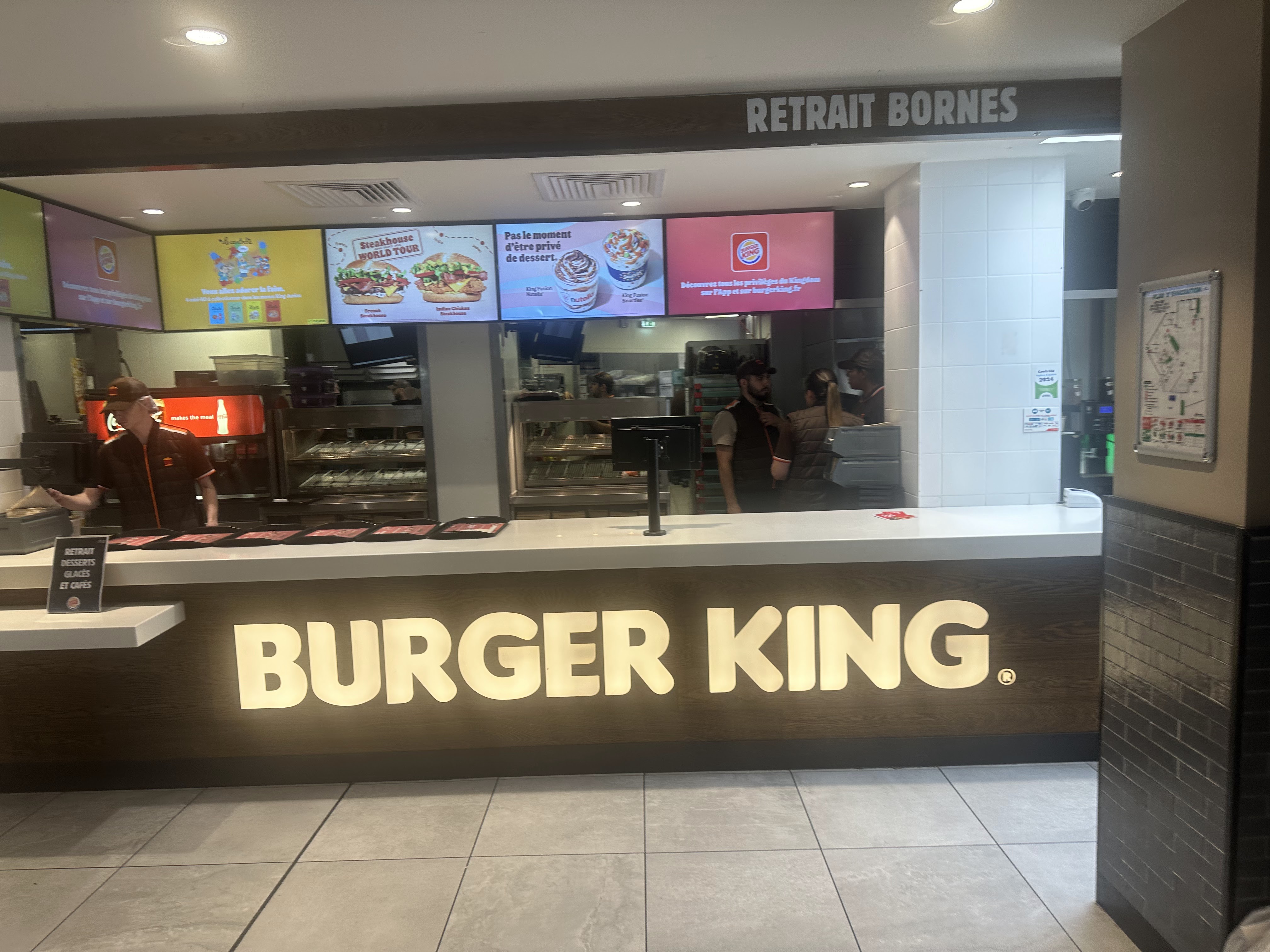 2 bornes sur 3 ne fonctionnaient pas au rez-de-chaussée.. Le restaurant se trouve au 1er étage. Il faut monter les escaliers ou prendre l'ascenseur vieillot. Je n'avais jamais vu un BK avec autant de monde😱. Attente d'une heure!!! À éviter aux heures de pointes. Propreté à revoir lorsque les locaux sont beaucoup empruntés.. pas de personnel en salle.