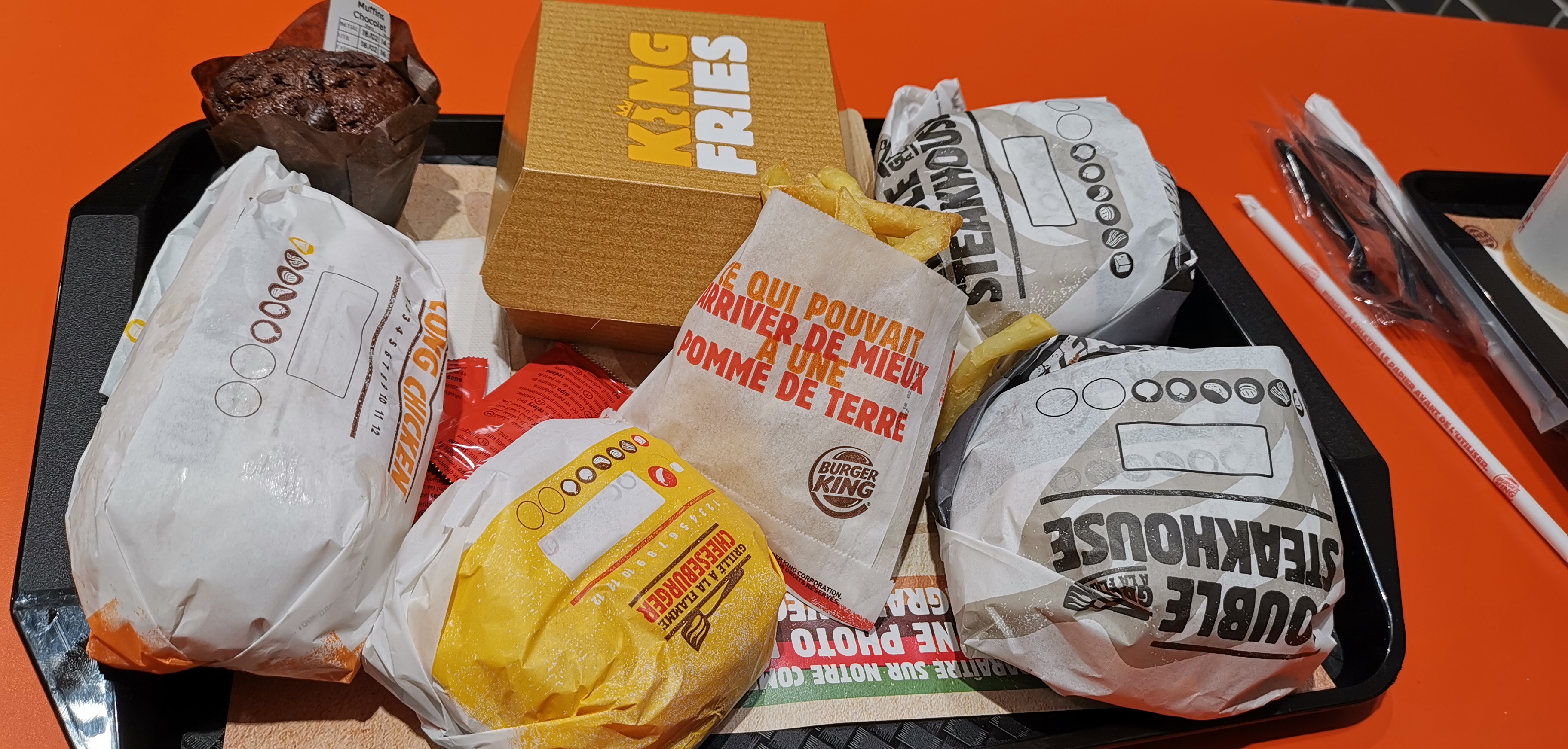 Rien a dire sur la commande, Mais le service une catastrophe, la serveuse ne dit pas bonjour, pose le plateau en nous bousculant sans s'excuser, pas de serviettes sur notre plateau. Si madame n'aime pas le contact avec la clientèle, elle devrait changer de travail.
