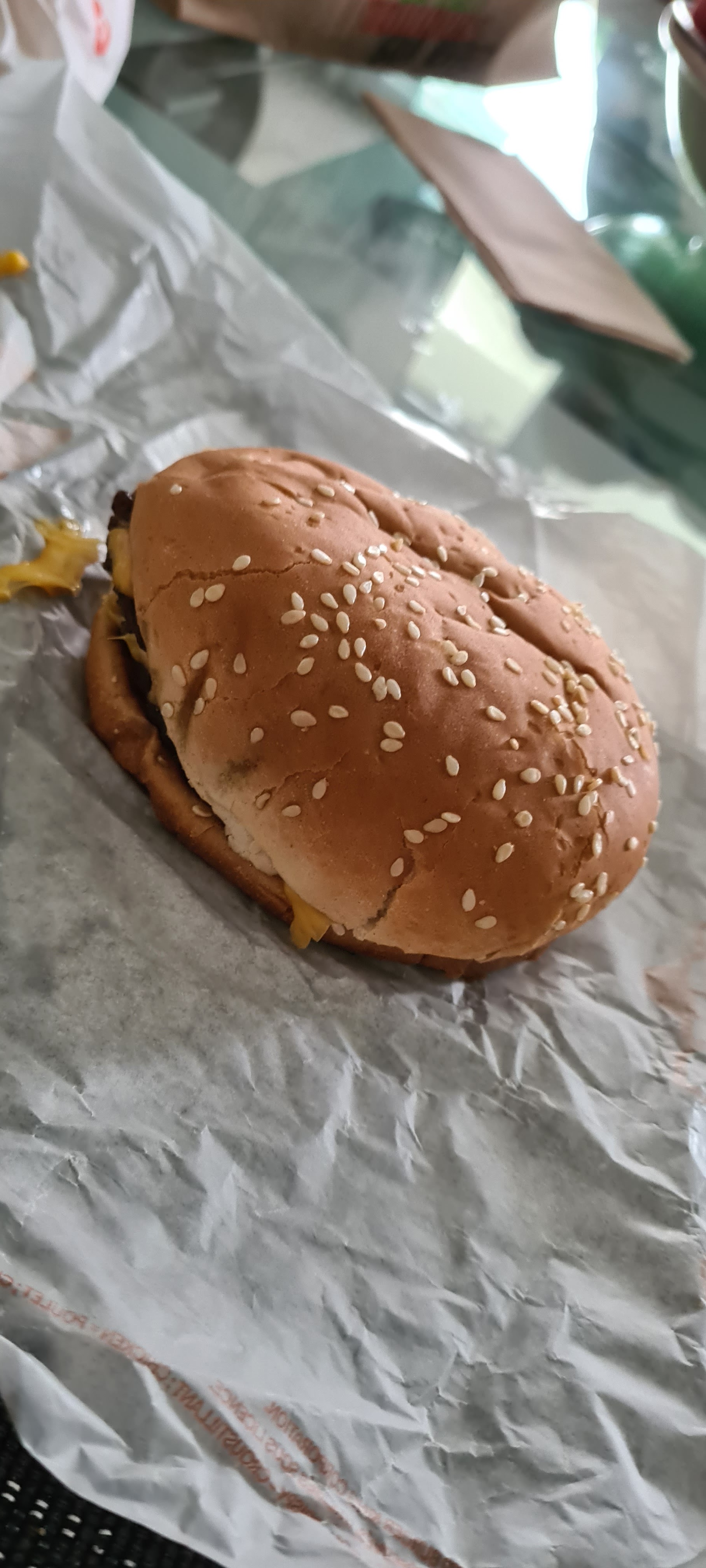 Quand vous acheté aujourd'hui le 23 mars un TRIPLE CHEESE ET QUE vous allez voir disant qui manque , la réponse est de voir le sac , ( photo prise ) elle nous dit que le sandwich est encrassé et que c'est bien UN TRIPLE CHEESE ( donc il manque 2 viande et 2 fromage !! Et la taille d'un sheese normal ) inadmissible nous prenant pour des DEBILE ! FAUT AVOUER SON ERREUR ET CHANGER .... Plus un pied la bas vive Macdonald !