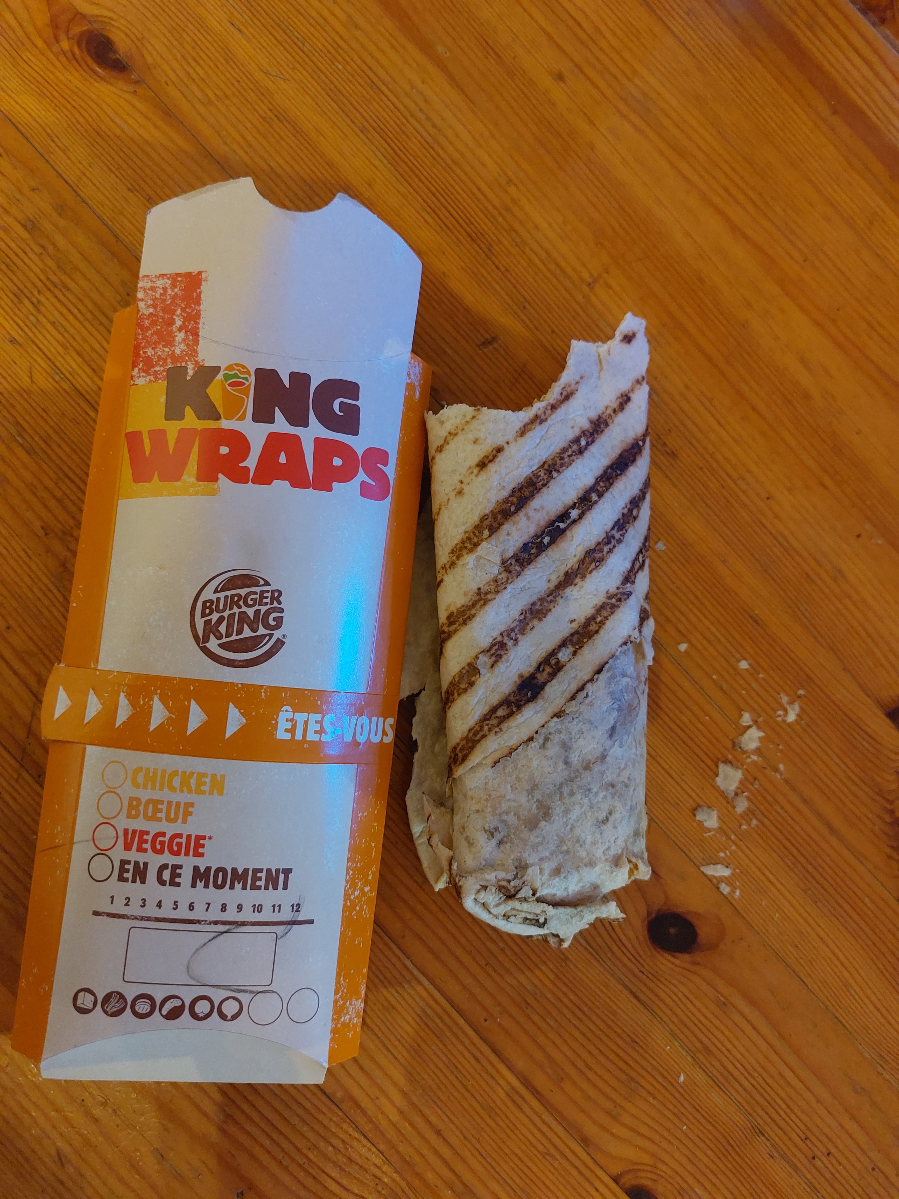 En général, je ne suis pas déçu par Burger King, mais celui de Val-de-Reuil c’est fort avec ses wrap chèvre J’ai commandé un wrap chèvre. J’ai reçu une brique. Je n’ai pas d’autres mots intérieur tout ramolli l’extérieur Super dur, à mon avis, ça doit faire quelques jours qu’il était cuit