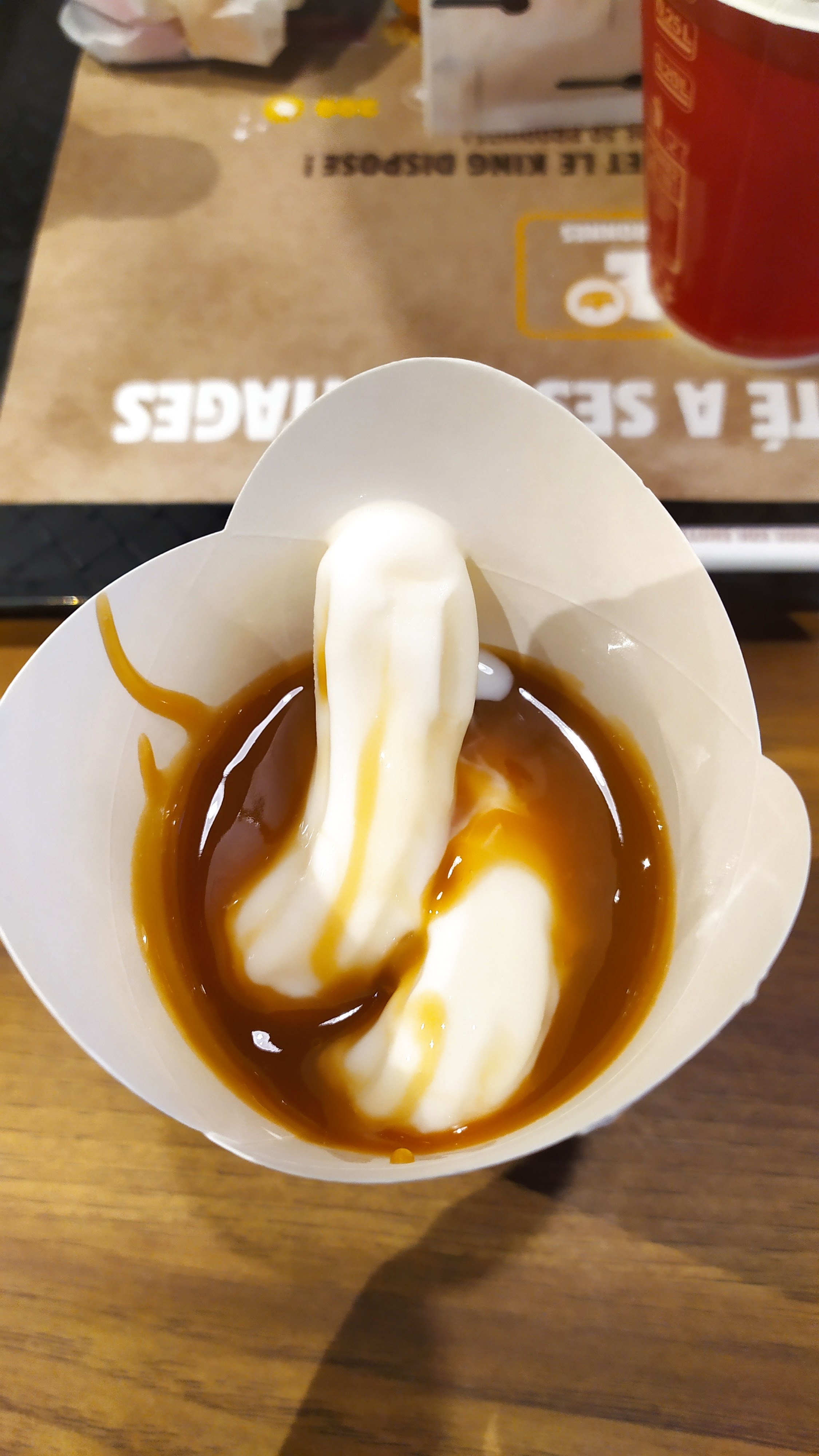 Venue ce soir vers 22h30 prise de commande par Melvin qui mérite 5 étoile à lui tout seul et ma commande a était donner par une dame à qui j’ai pas eu temps de lire le prénom et qui apparement la politesse « bonjour aurevoir » n’existe pas. En plus de sa les frites froides pas génial… Ma glace je demande caramel supplément caramel qui est à 0.60€ je vous montre ma glace en photo.. très déçu de mon expérience ce soir pourtant je viens régulièrement..