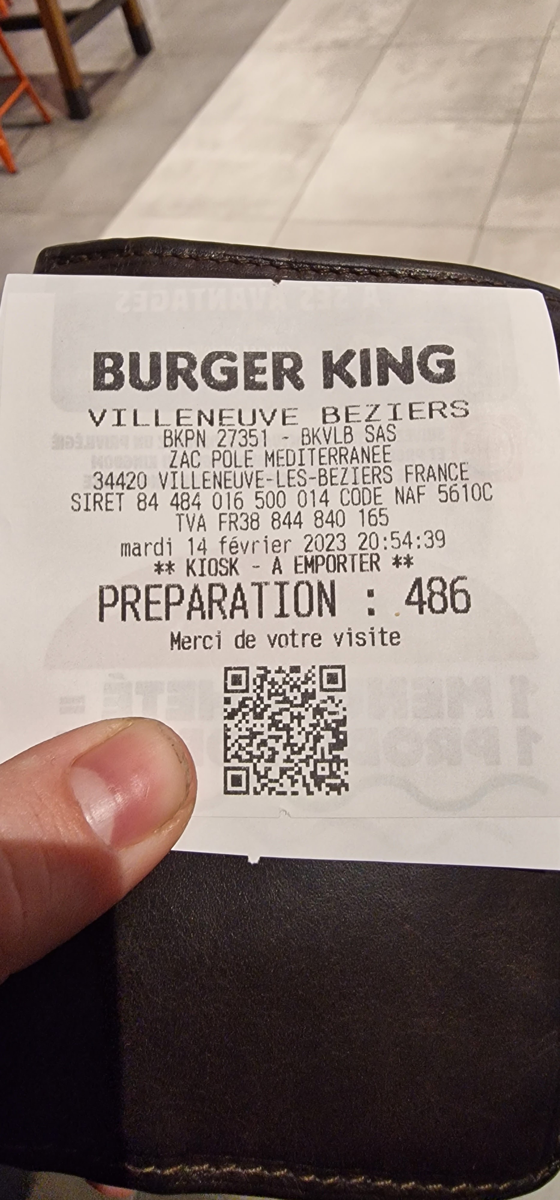 C'est un Burger King, pour la première fois j'ai vérifié que ma commande était complète dans un BK et je suis content de l'avoir fait car il manquait des articles, rapidement résolus mais si je n'avais pas vérifié, je serais parti de là et je n'aurais pas été heureux.