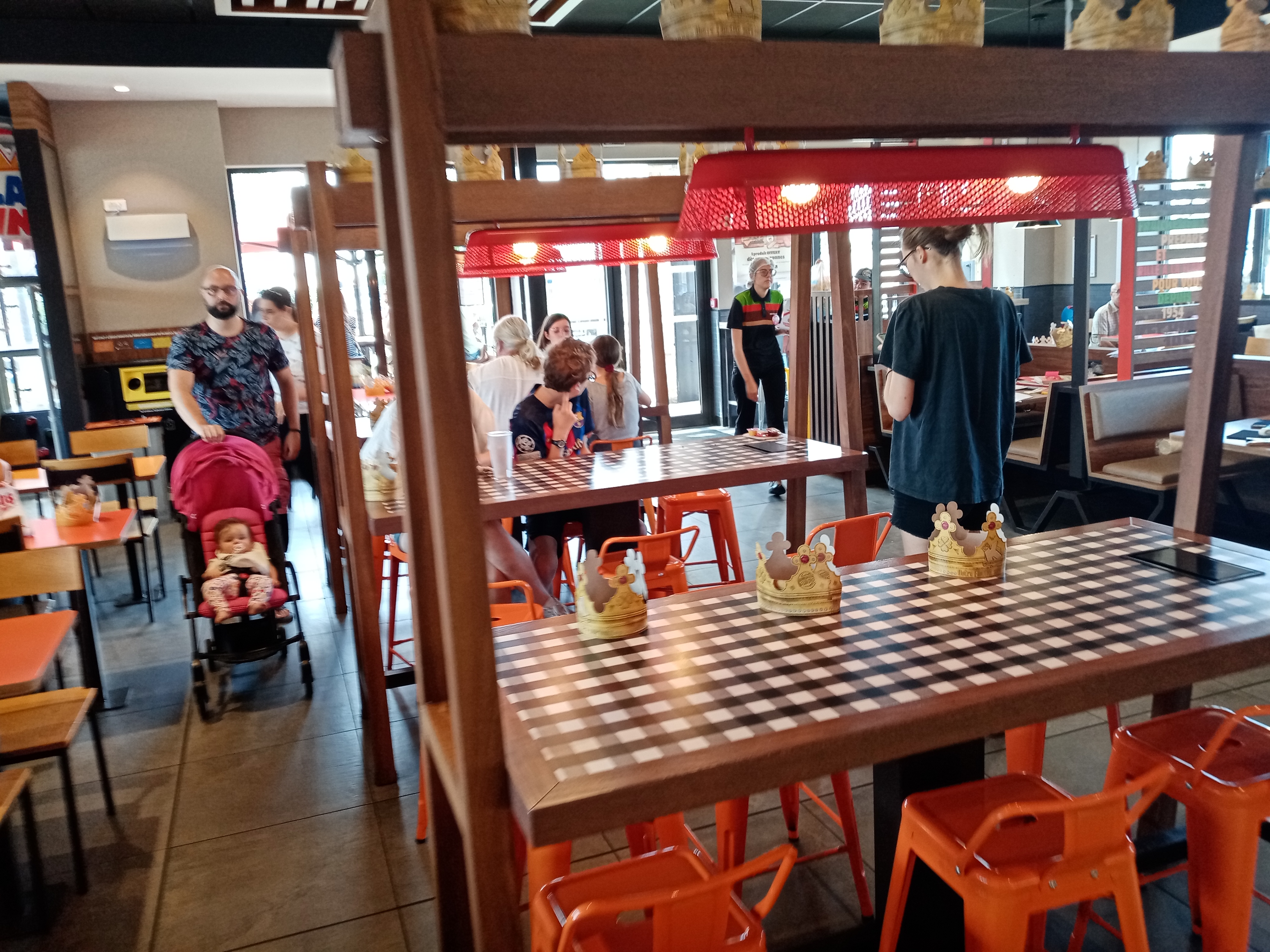 Le Fast Food est assez grand mais pas assez vu l’affluence qu’il y a quand on y est allez il n’y avais plus de place assise le service à table était très très très lent même si ça on ne peut pas leur en vouloir car il y avais beaucoup de monde. Les toilettes ne sont pas propre du tout il y a de la pisse de partout.