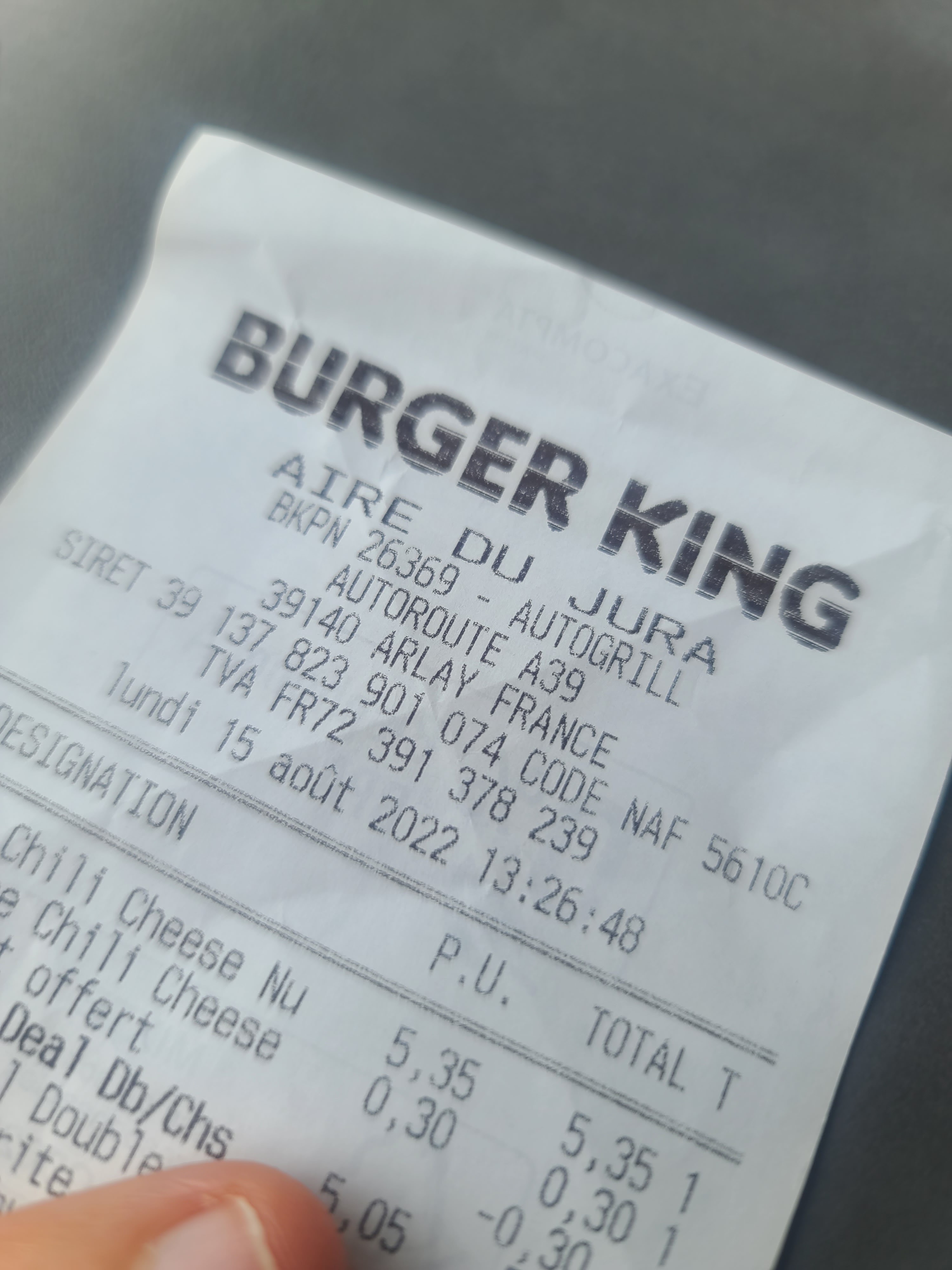 Pour un Burger King c'était pas mal. Une jeune serveuse super aimable et souriante, cela fait plaisir. Maintenant, cela n'a rien à voir avec votre enseigne mais SUPER Déçue de ce qu'est devenue l'aire du Jura