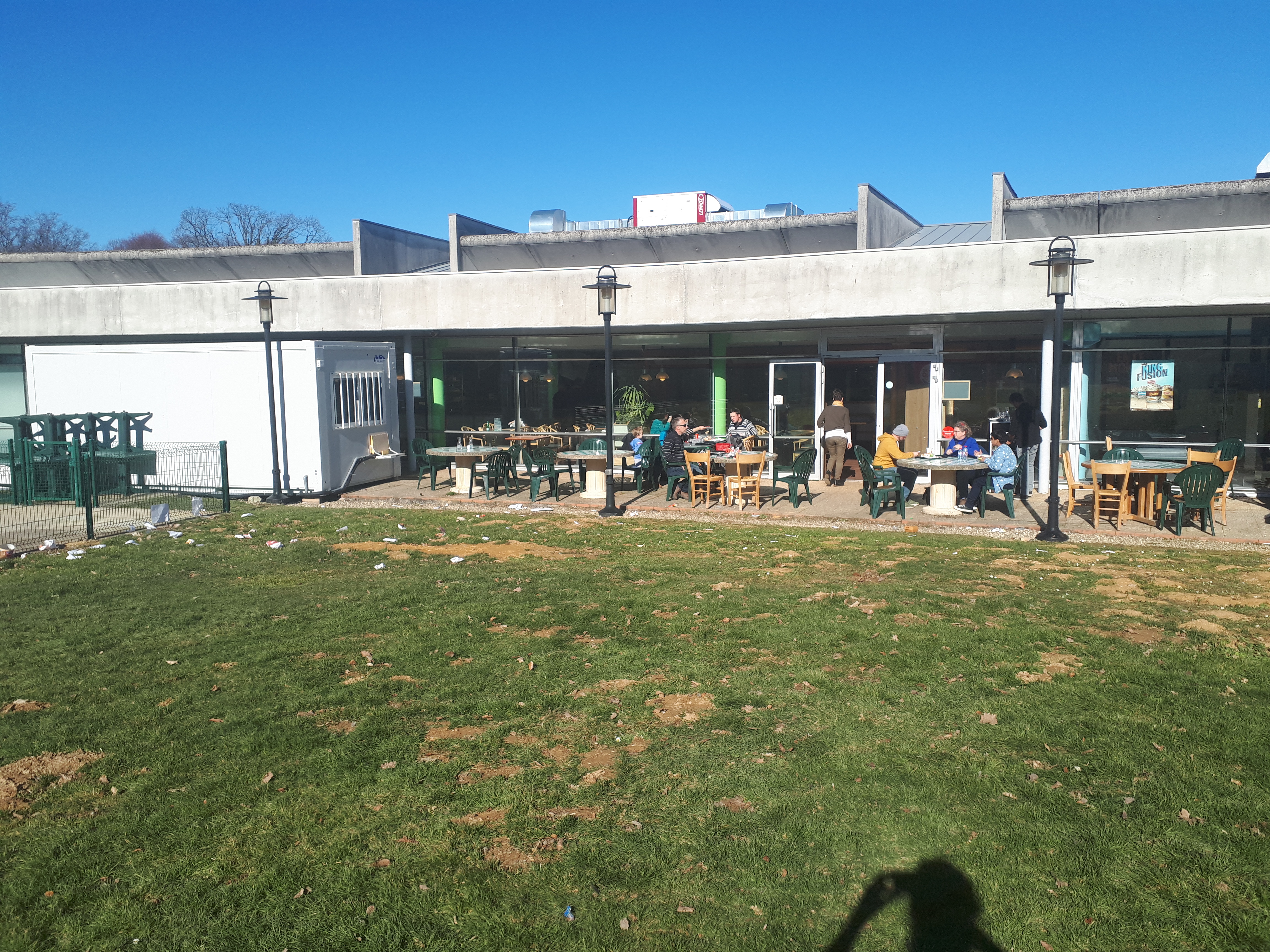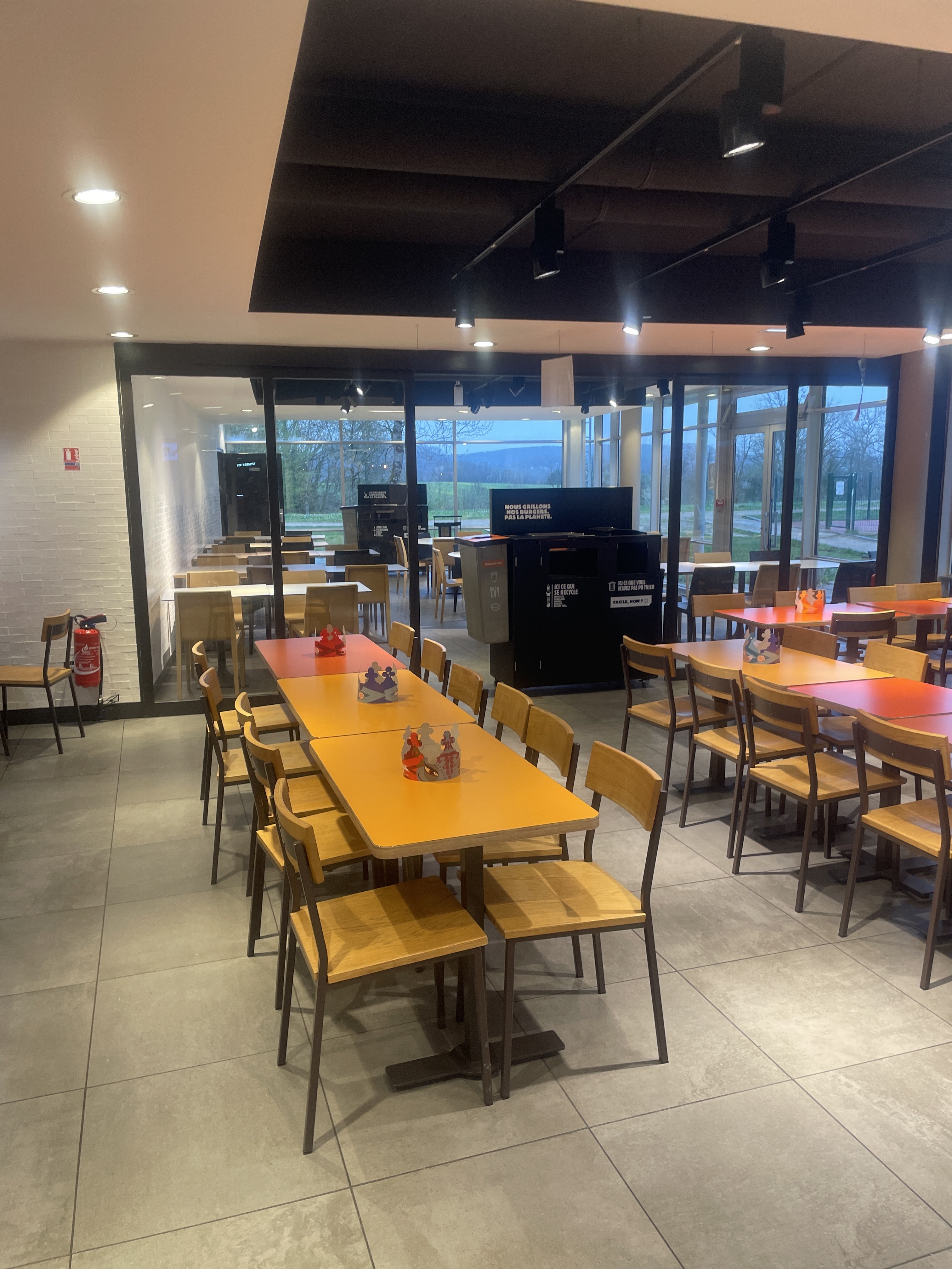 Arrivée sur un grand parking.plusieurs bornes ne marché pas.pas de tickets non plus . beaucoup d'attente.on peut manger a l'intérieur et a l'iextérieur .espaces vert.manque une personne au comptoir dans les heures de pointe.