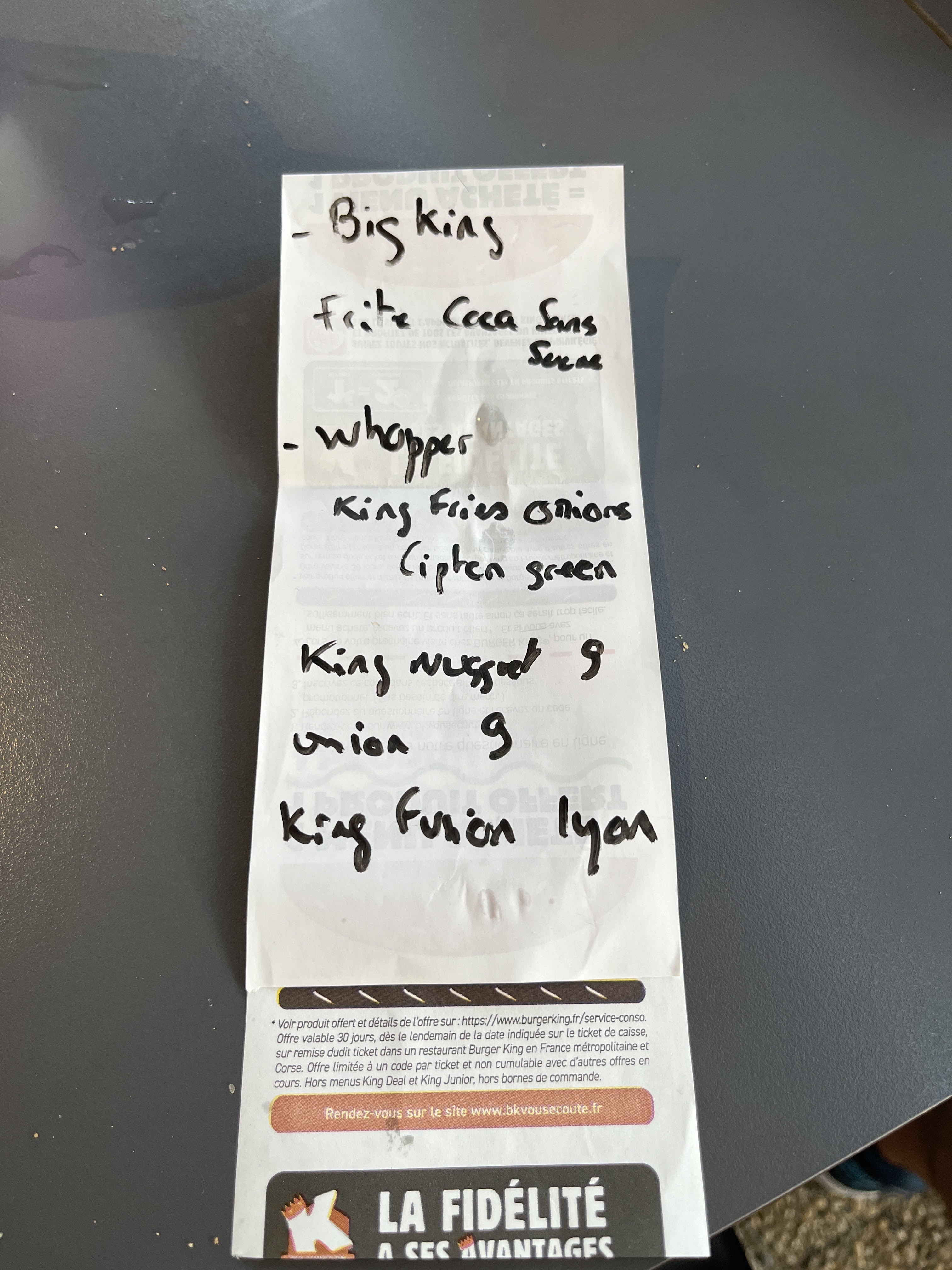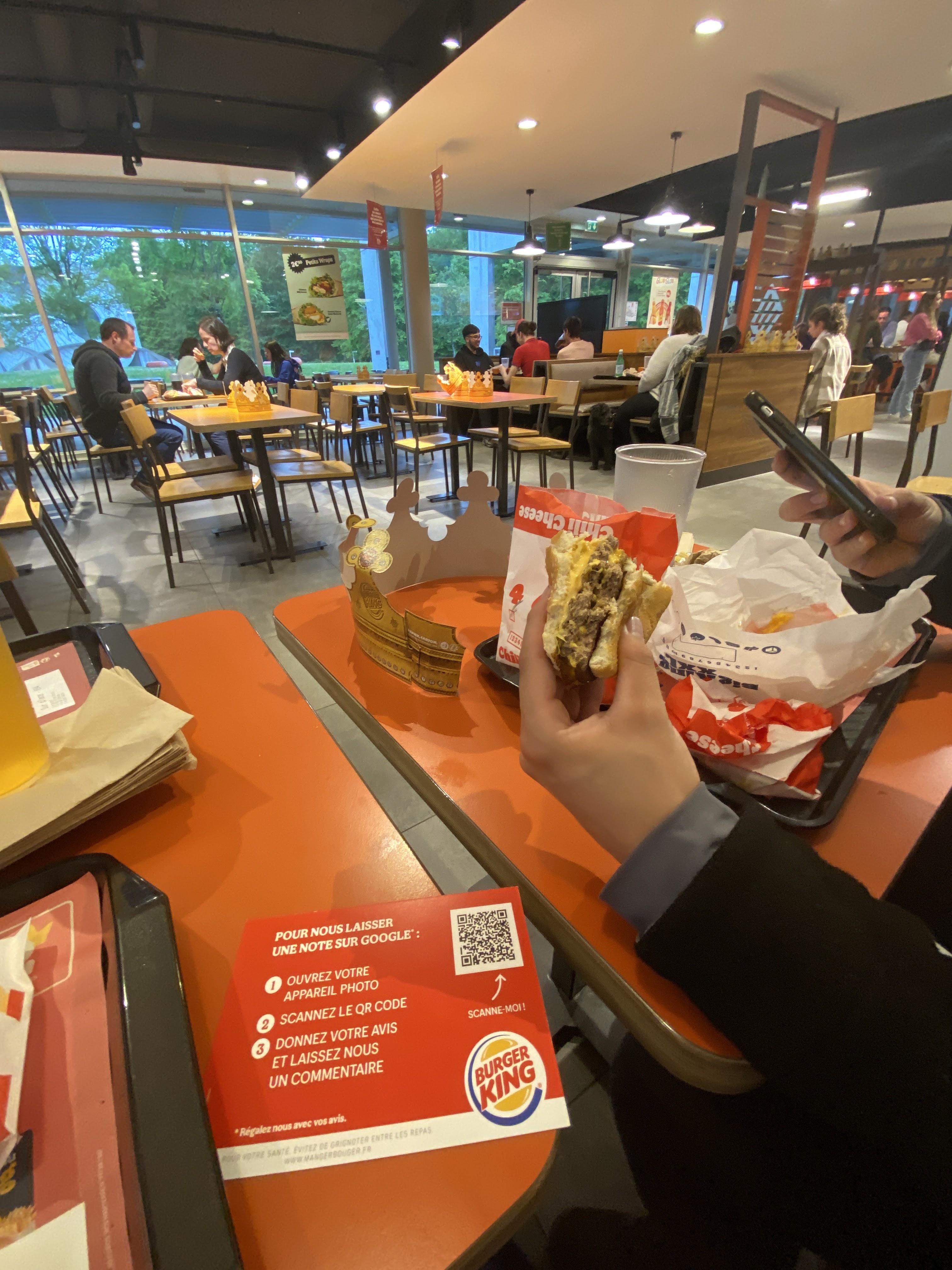 Les meilleurs blagues sont souvent les plus courtes. Malheureusement pour nous la blague à durer 50minutes pour être servis, l’équipe ne communique pas, cela est bien trop visible. Erreurs sur erreurs, 50 commande à attendre avant d’être servis. Pour couronner le tout, c’est mieux pour le roi du burger d’avoir une couronne, nous ne pouvons même pas nous reposer car nous (la horde de clients en attente) monopolisons la majorité de l’espace pour s’asseoir… La prochaine fois je poserais un RTT.