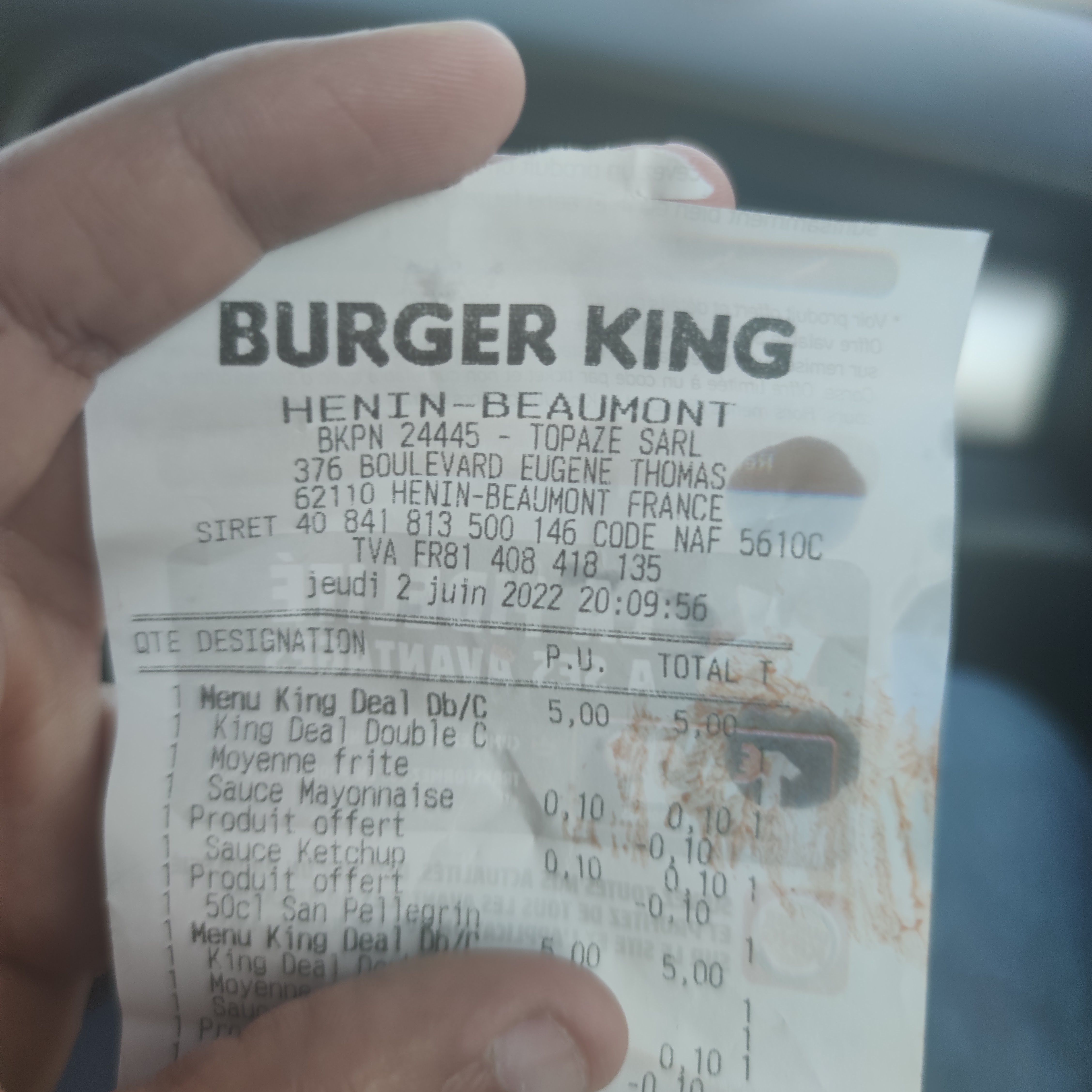 Client régulier de ce burger king et globalement satisfait, par contre ce midi pas satisfait du tout. Impossible de scanner le qr code et pas de ticket pour le rentré plus tard ! On m appel pour ma commande, je me présente non ce n est pas ce que j ai dit... Soit. Un jus d orange au lieu d'un coca, un minute maid au lieu d un ice tea,et le dessert des pommes au lieu d une compote, je demande à changé on me le fait mais on me soutiens que c est ce que j ai pris ! Le coca arrive sur le plateau à moitié renverser sur la bd de mon fils... Pas une bd à un million mais je la paie quand même ! Arrivé en haut je me rends compte que le hamburger n été pas celui commandé et en plus froid. Je n ai egalment que 2 mayos, alors qu il y en avait 2 pour le menu adulte et une mayo un ketchup pour enfant avec un surcoute de 0.20 cts que je n ai pas eut ! Commande 225 passer vers 12h30
