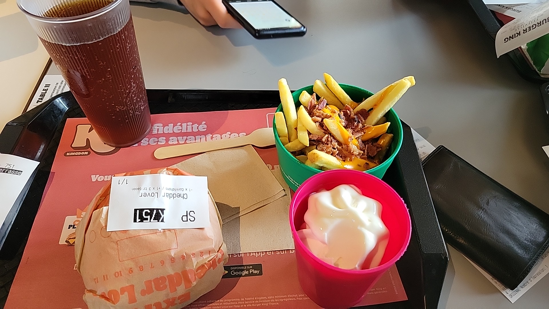 Scène assez lunaire qui ce passe devant mes yeux quand j’entends un des vendeurs dire très exactement Il a jamais commander à emporter lui, il est fou à son collègue mais devant le client. Le client du coup, lui montre son application et lui dit chef, c’est à emporter que j’ai mis, regarde par toi même le vendeur l’ignore, le client le rappel. Et là le vendeur ce met à menacer le client en disant pourquoi tu cris fort comme ça ? Tu vas faire quoi ? Le client demande donc un responsable et le responsable sonne au grand absent de la journée bizarrement. Cependant on préparait ma commande à ce moment là, et il me manque 1 sandwich sur trois. Un grand Wrap. Ça me semble assez visible sur une commande selon moi. Je reste très polis quand je parle du vendeur car selon moi il n’a rien à faire dans espèce de vente. Repas froid frite farineuse, j’ai ouvert mes sandwich 9 minutes après être partis du Burger King.