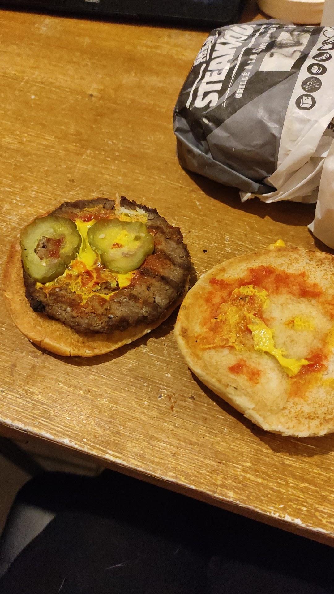 Berk! Pain smuggy - traduction mou qui boit tout de suite un entassement de sauces. Quant a la viande : 2 tuiles goût brûlé grises sèches...berk!! Par contre bonnes frites légères pas grasses. Quand je reviendrai je me limiterai a vos nuggets la prochaine fois que j'accompagnerai ma famille. Désolée pour vous! Mais je préfère de loin MacDo 😂