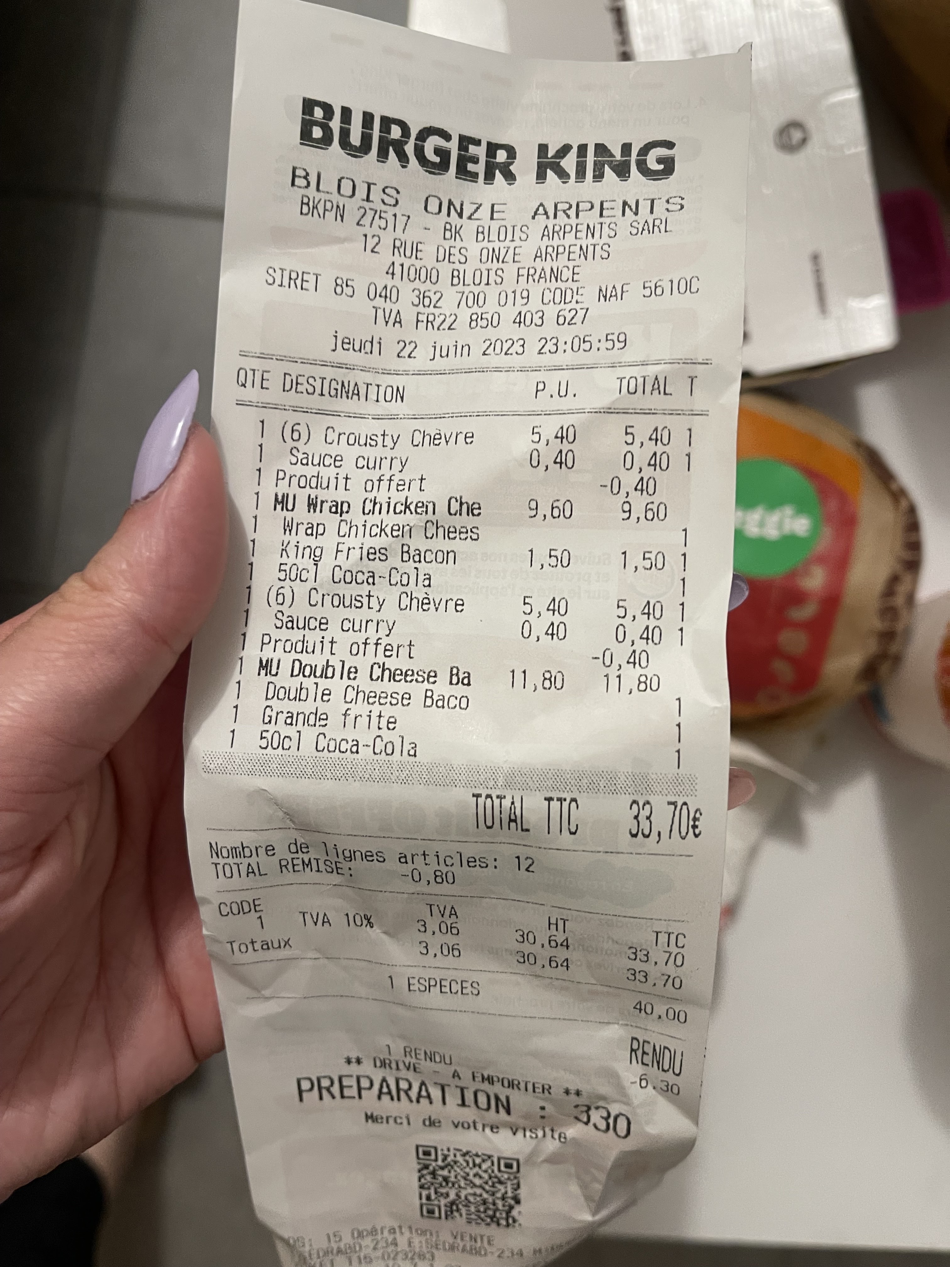 Inadmissible !!!! On vient de chailles a 22h45 pour ce faire un petit Burger King ! Photo ci joint du bon de commande ! Rien de tout ce qu’on a commandé ! 32€ pour au final 1 frite et deux sandwich ! Résultat des courses? On a perdu 32 euros !!!!! 😡😡😡😡 ou sont les crousty chèvre et cheese ???? Le wrap au poulet ??? La deuxième frite ?? Honteux !!!