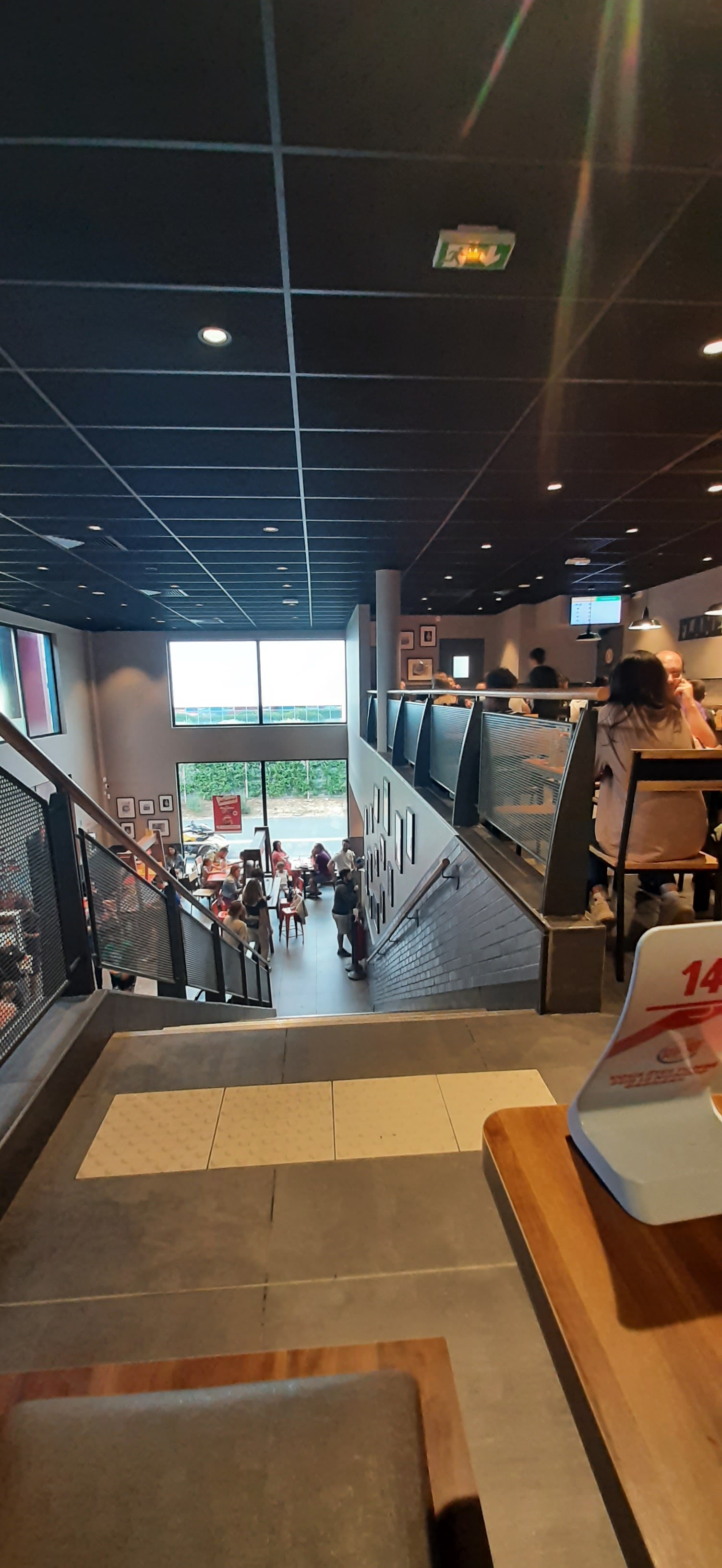 Là car nécessité de manger avant d'aller au cinéma et franchement je regrette. Entre la commande non respectée (en même temps, entre le ticket sortant de la borne de commande et le ticket sur plateau, il y a des différences) , les onions rings très mous et pas croustillants, les sauces dites curry qui contiennent de la mangue (vives les allergies), les boissons sans glace demandées avec et inversement, les salarie•es qui traînent les pieds et qui tirent la gueule, la propreté plus que douteuse des tables, des sols et des murs, je ne sais plus où donner de la tête. Seul point positif, la personne qui sortait nous tenant la porte quand nous sommes arrivés. PS : Écrits en braille à revoir car il y a des fautes.