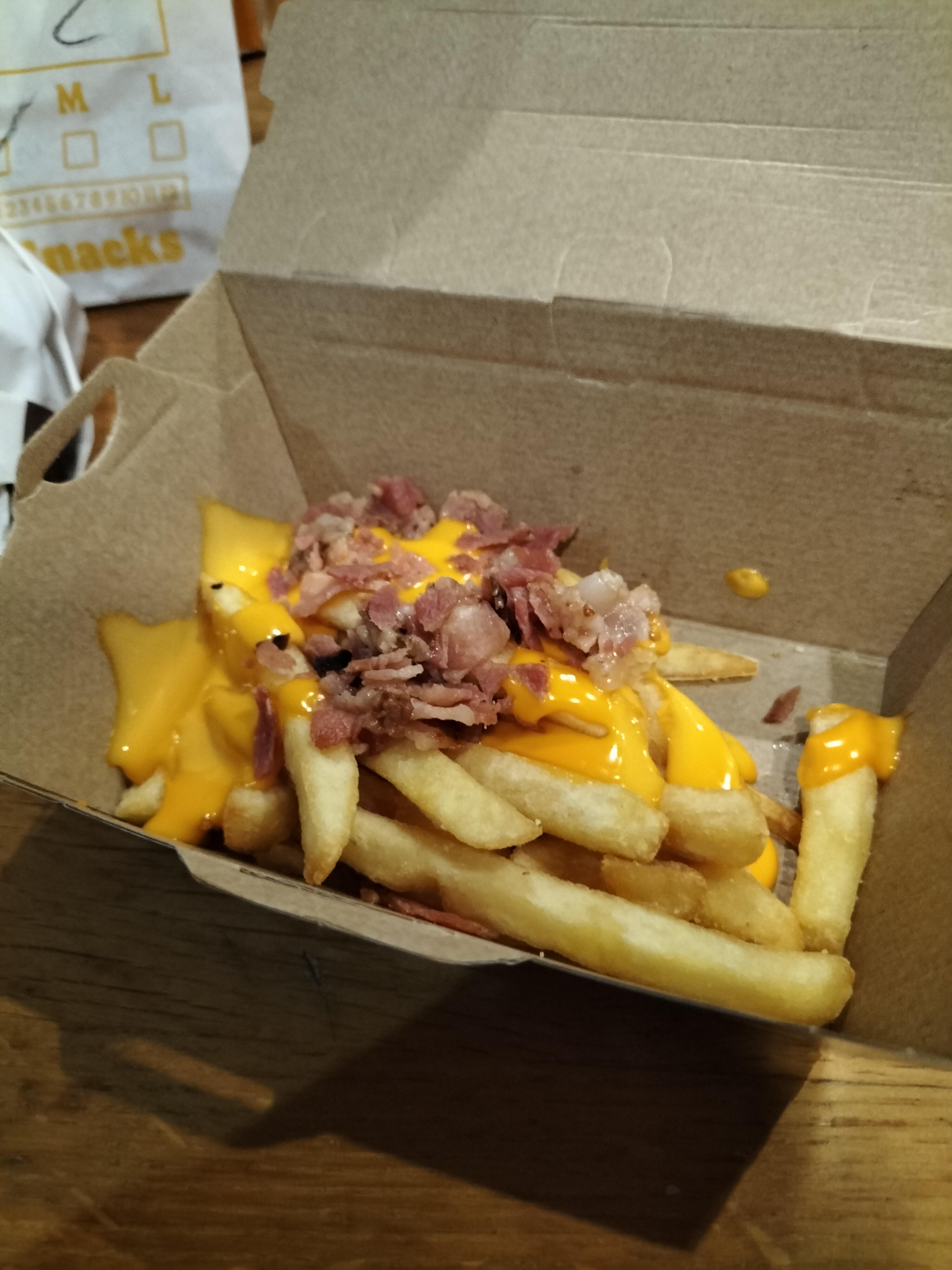 Frites taille XL + supplement 1e50 pour cheddar et bacon, resultat = une portion égale a une petite frite..