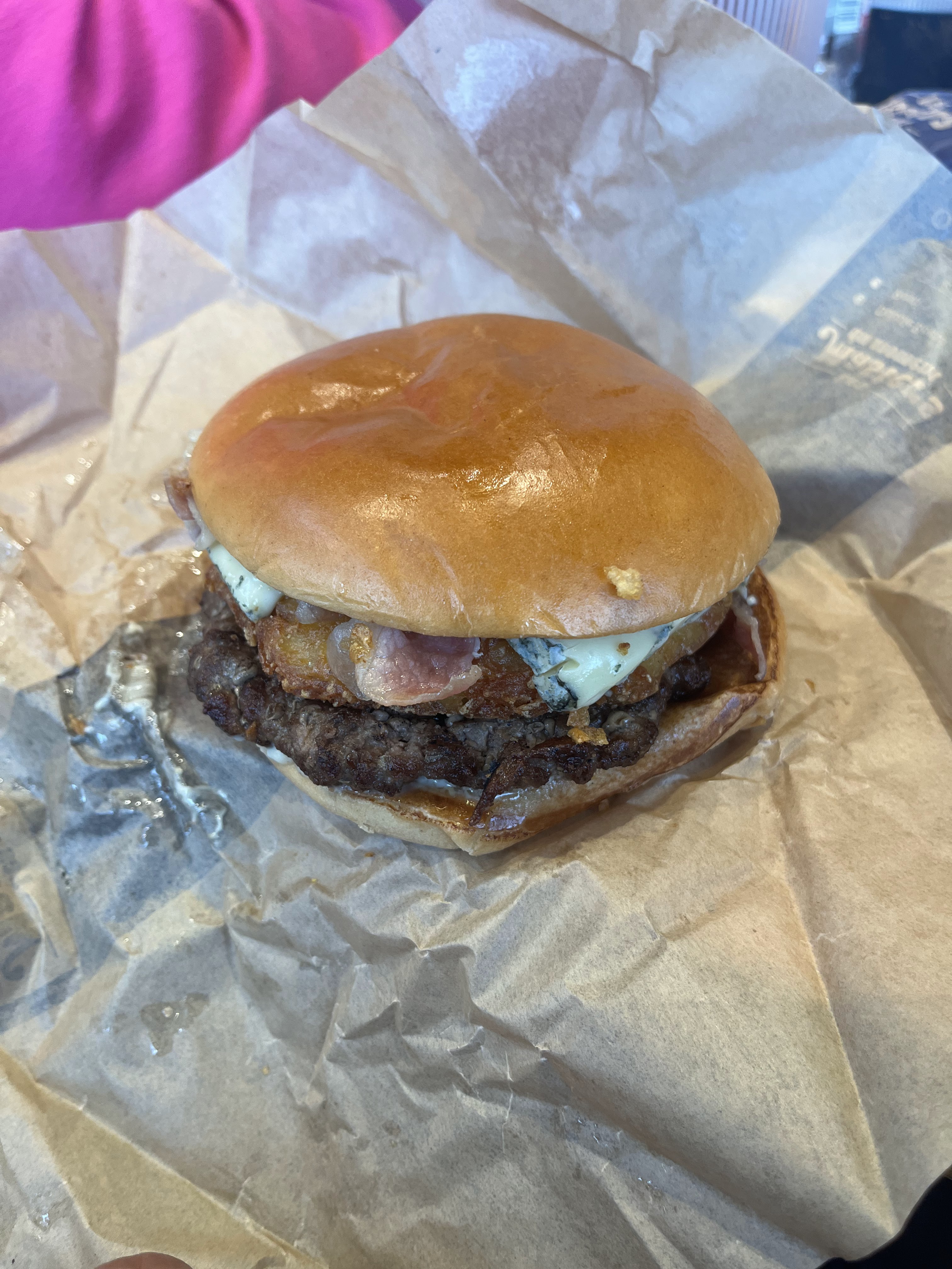 Deux menus double wooper cheese commandés et reçus rapidement compte tenu du monde qu'il y avait ce samedi 13h. Burgers superbes et onion rings excellents. Seul manquait les 3 sauces barbecues mais une serveuse qui passait à côté de notre table a été en chercher dès que nous lui avons demandé.