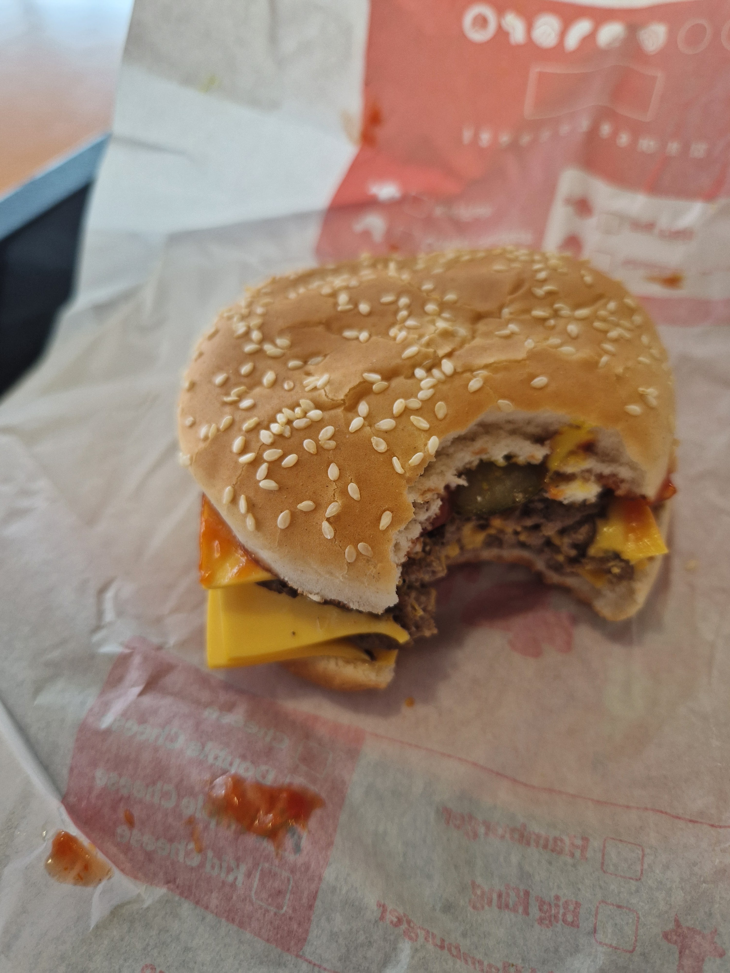 Euh c'est normal que mon sandwich BIG King fasse la même taille que le cheeseburger du menu enfant de mon gamin ? (Cf. Photo) c'était pareil la dernière fois avec mon steakhouse. Si vous avez divisé par 2 la taille de vos gros sandwichs ce serait bien de prévenir vos clients. Bonne journée.