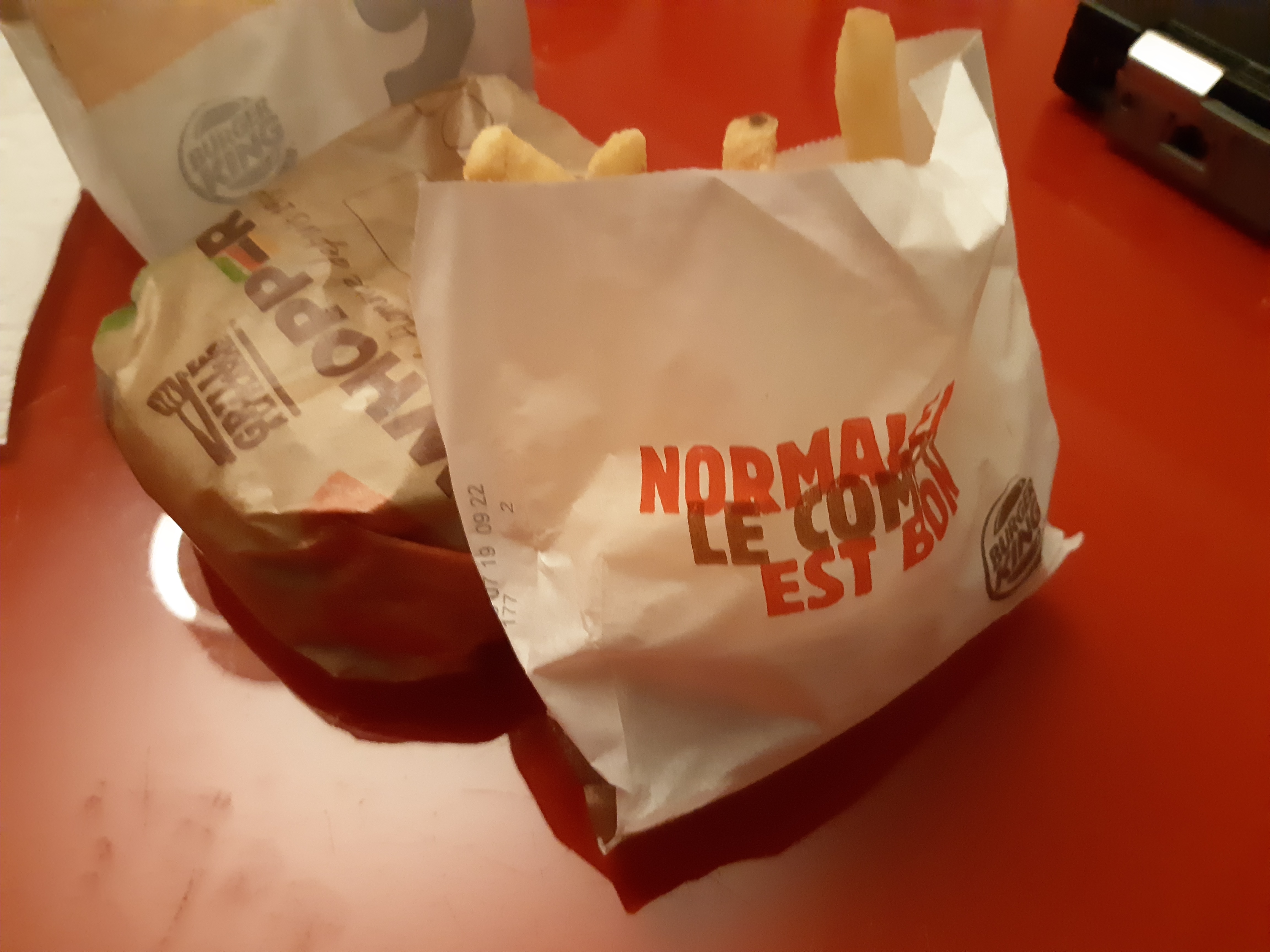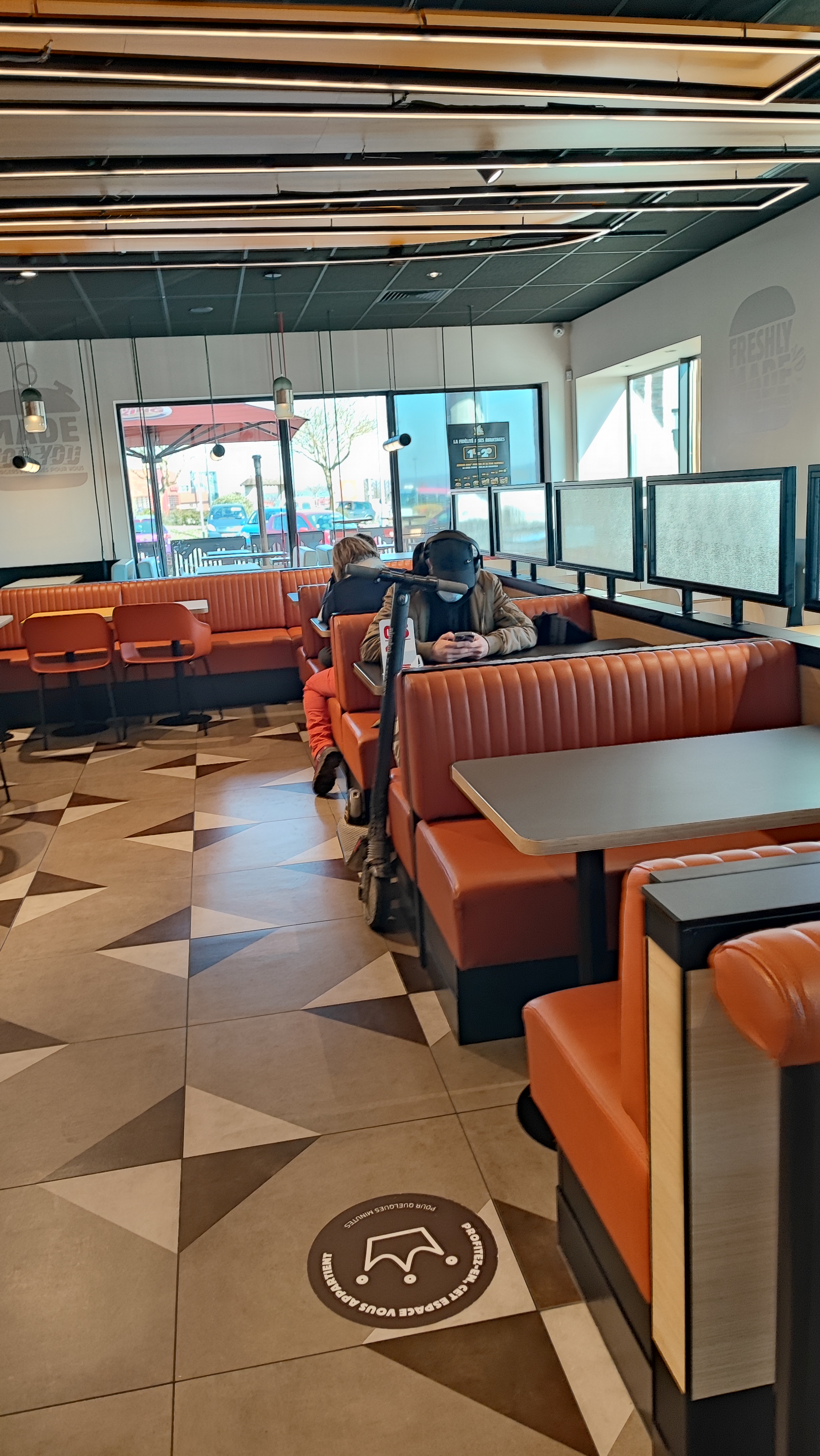Burger king, c'est Burger king pour ce qui concerne le repas. Oups pour les toilettes dont le lave-mains et le sèche-mains n'ont pas eu de nettoyage depuis plusieurs semaines... calcaire gris, cheveux, poids de barbe 😒 Aucune borne ne permettant l'édition de la facturette et donc du coupon café... Cette ambiance ne correspond pas à celle de Burger king habituellement...