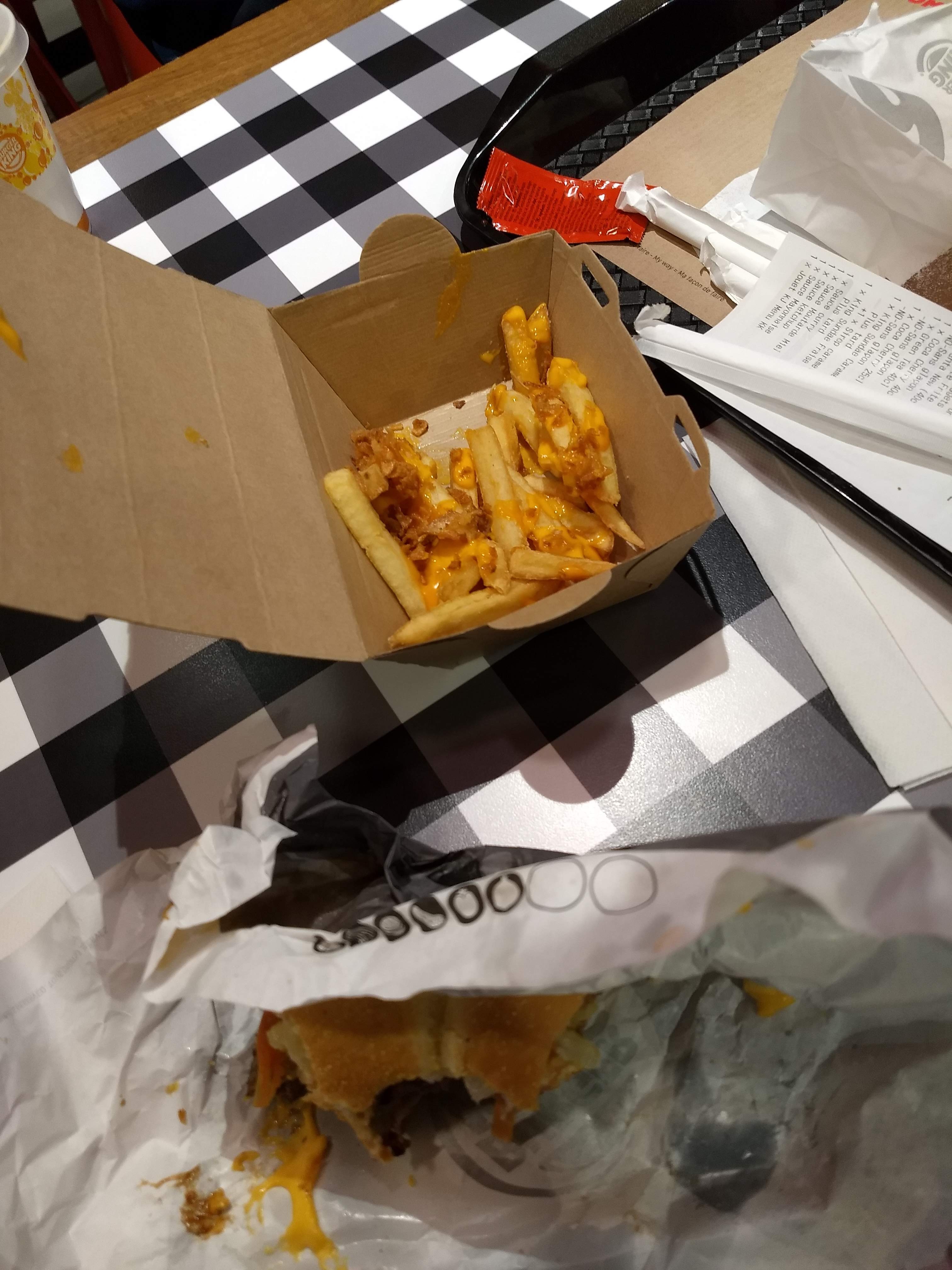 Ça devient de pire en pire.. limite plus de cheddar ni bacon dans les king fries.. commande un menu X-tra pour au final avoir un petit coca au lieu d’un fuze tea.. réveillé vous un peu, c’est dommage des faire de plus en plus de perlouse comme ça.. avant c’était top 👍🏻