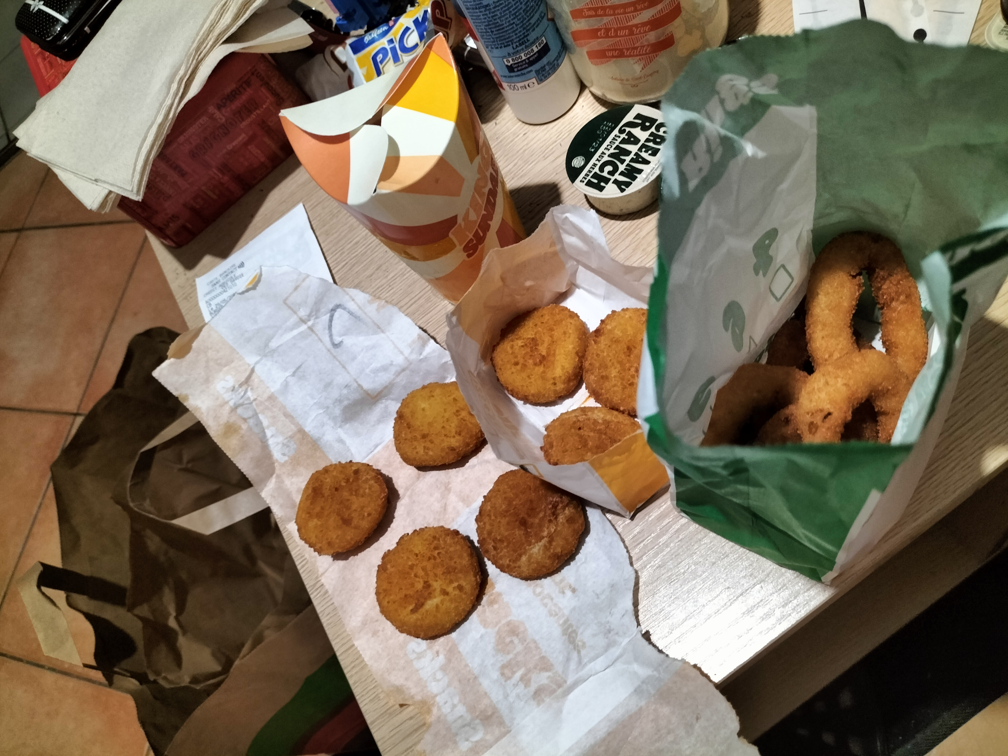 Déçu!!!! Pas beaucoup de monde!! Mais quand même 2 crousty chèvre sur 9 et 3 onion rings sur 9 manquant dommage que c'était a emporter car sinon je leur aurait dit... Sans parler des sauces qu'il faut ouvrir avec les ongles car la pellicule ne s'enlève pas....