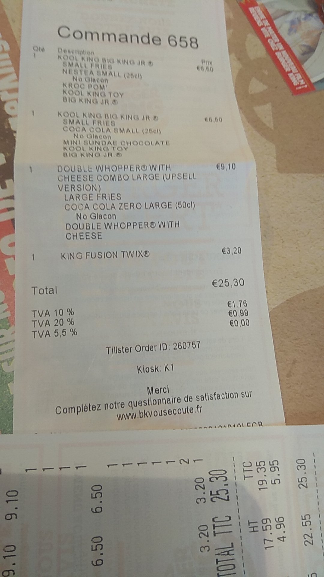On peut se tromper sur une boisson mais pas sur les deux… J’ai commandé 2menus à emporter avec 2 fuze tea pêch et en rentrant chez moi j’ai eu 2 coca cola… La semaine dernière pareil avec un menu enfant. Et dire que pour 28,40€ qui est quand même chères j’aimerais avoir ce que j’ai commandé. Conclusion : Toujours regarder de A à Z tout ce que l’on a commandé avant de partir sinon on risque d’avoir une surprise. J’espère avoir un geste de burger king…