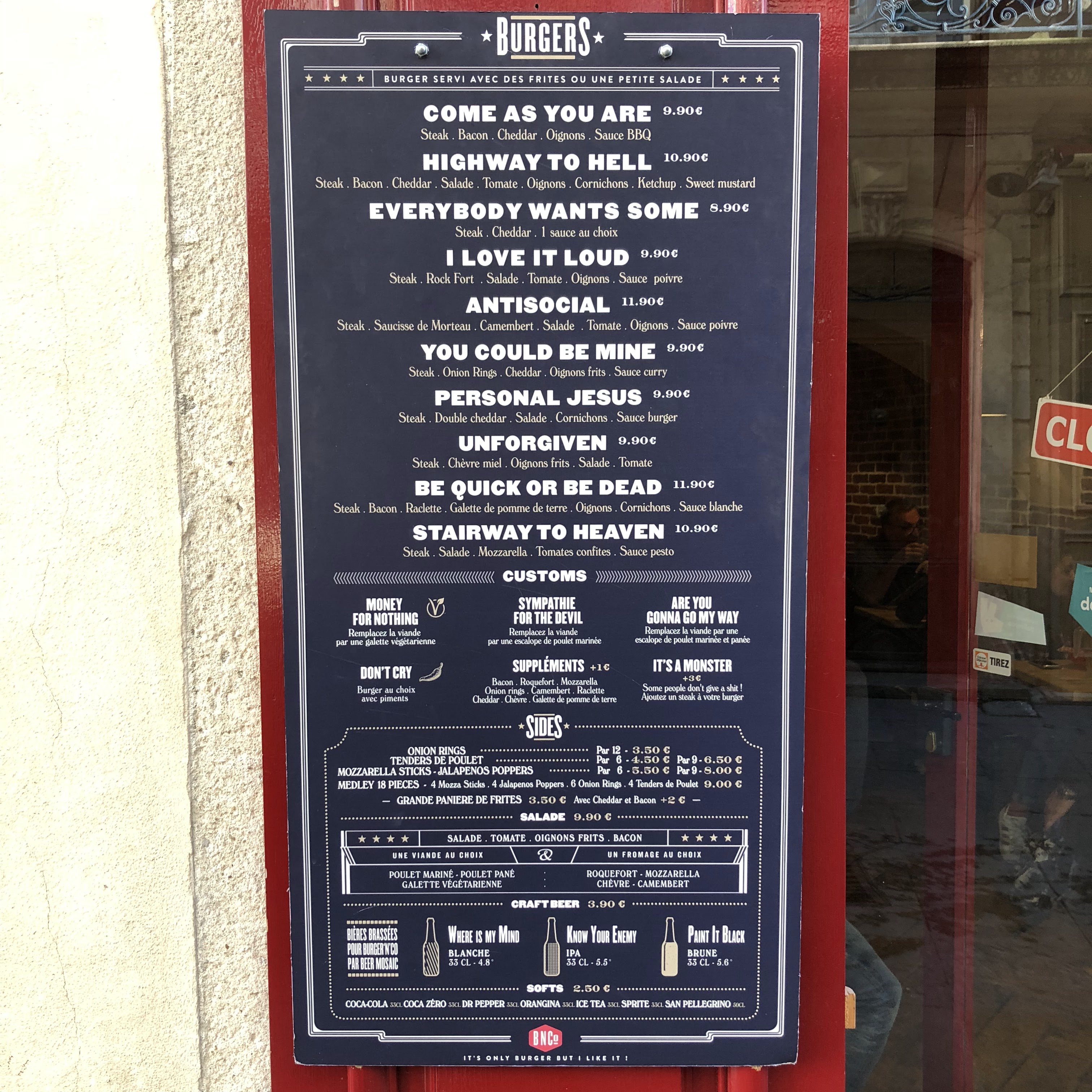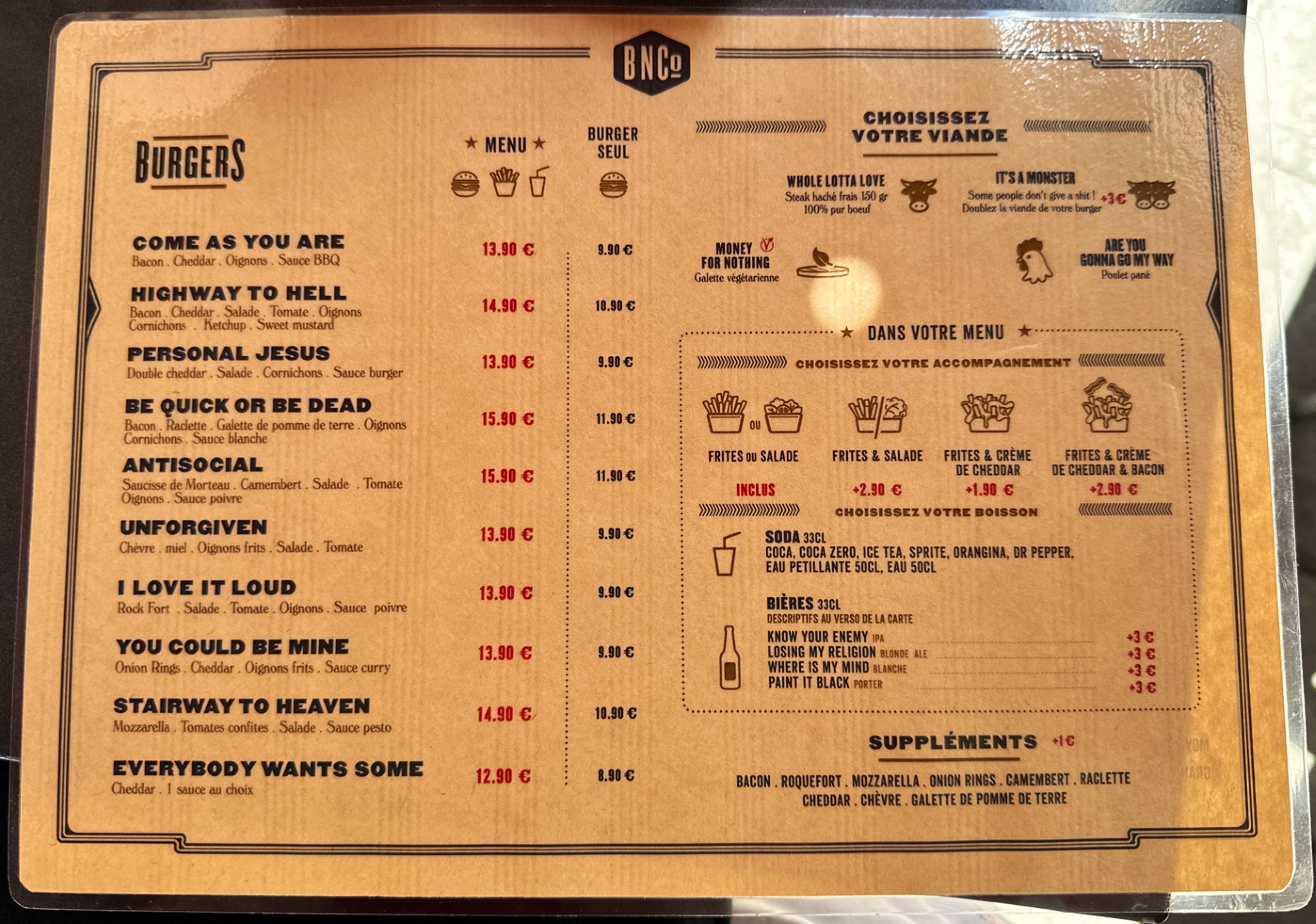 Très bon burger (j'ai essayé celui au curry et oignon rings) ! La petite salade est très bonne également. D'autre part le principe avec les noms des produits remplacés par des noms de chansons de rock est rigolo.