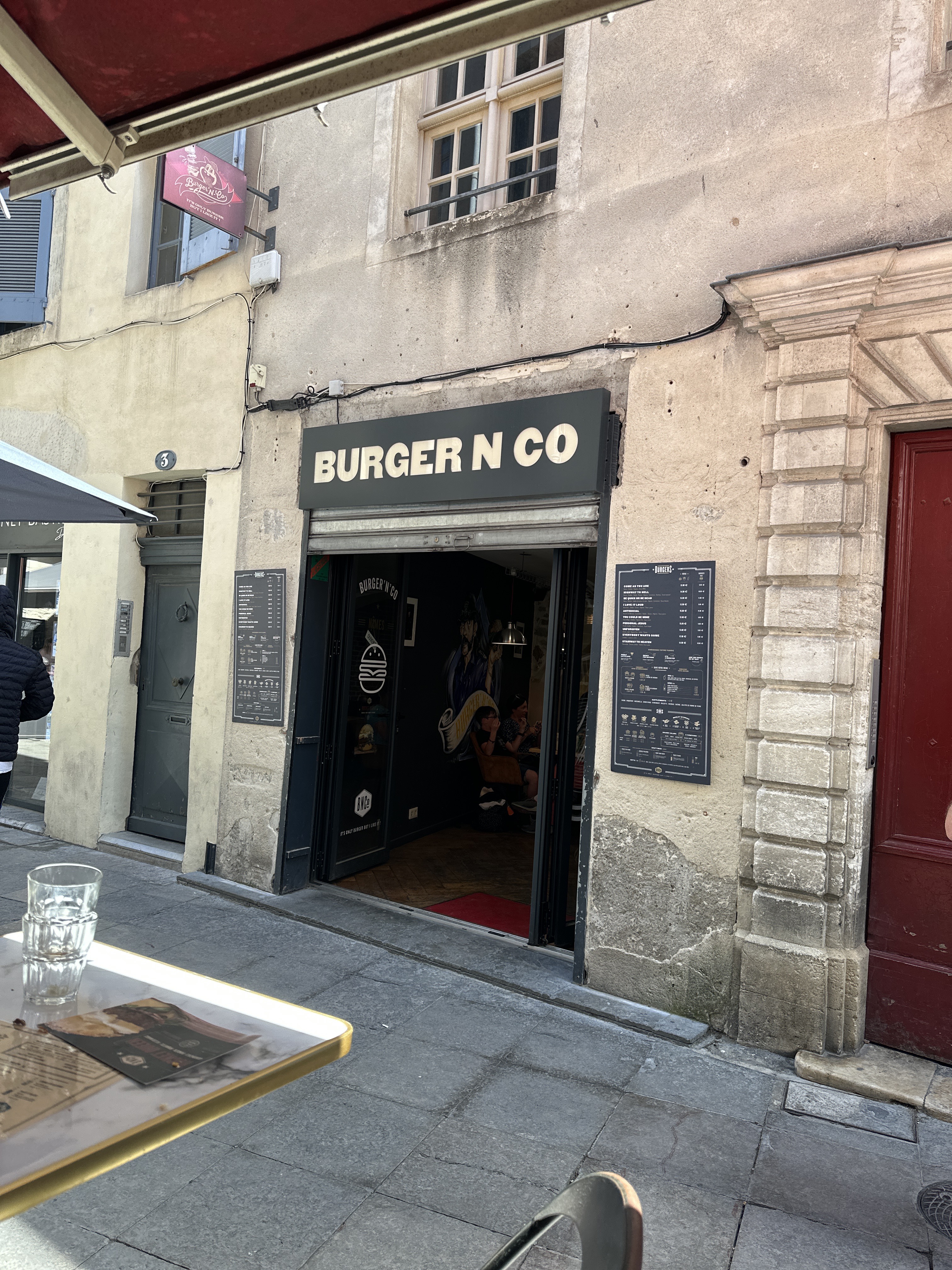 Venus pour visiter Nimes et ses alentours, nous nous sommes perdu dans les jolies petites ruelles de Nîmes. Après avoir croiser le fameux crocodile de Nîmois, nous avons atteri chez Burger'n'co. Et la, RÉ-VÉ-LA-TION. La même playlist qu'à la maison, le nom des burgers sonnent en coeur ce doux rock'n'roll qui enjolive le patrimoine musical. Et ce n'est que le début, car les burger sont monstrueux et monstrueusement bon et bien garnis. Nous avons pris un menu et des sides et sans nul doute, tout est fait maison. Et le service, royal, la serveuse (qui je pense était la patronne) nous a donné autant d'énergie que la musique qui passait, et nous a très bien conseiller pour nos escapades future dans le pays Nîmois. Merci Burger'n'co et merci le Rock.