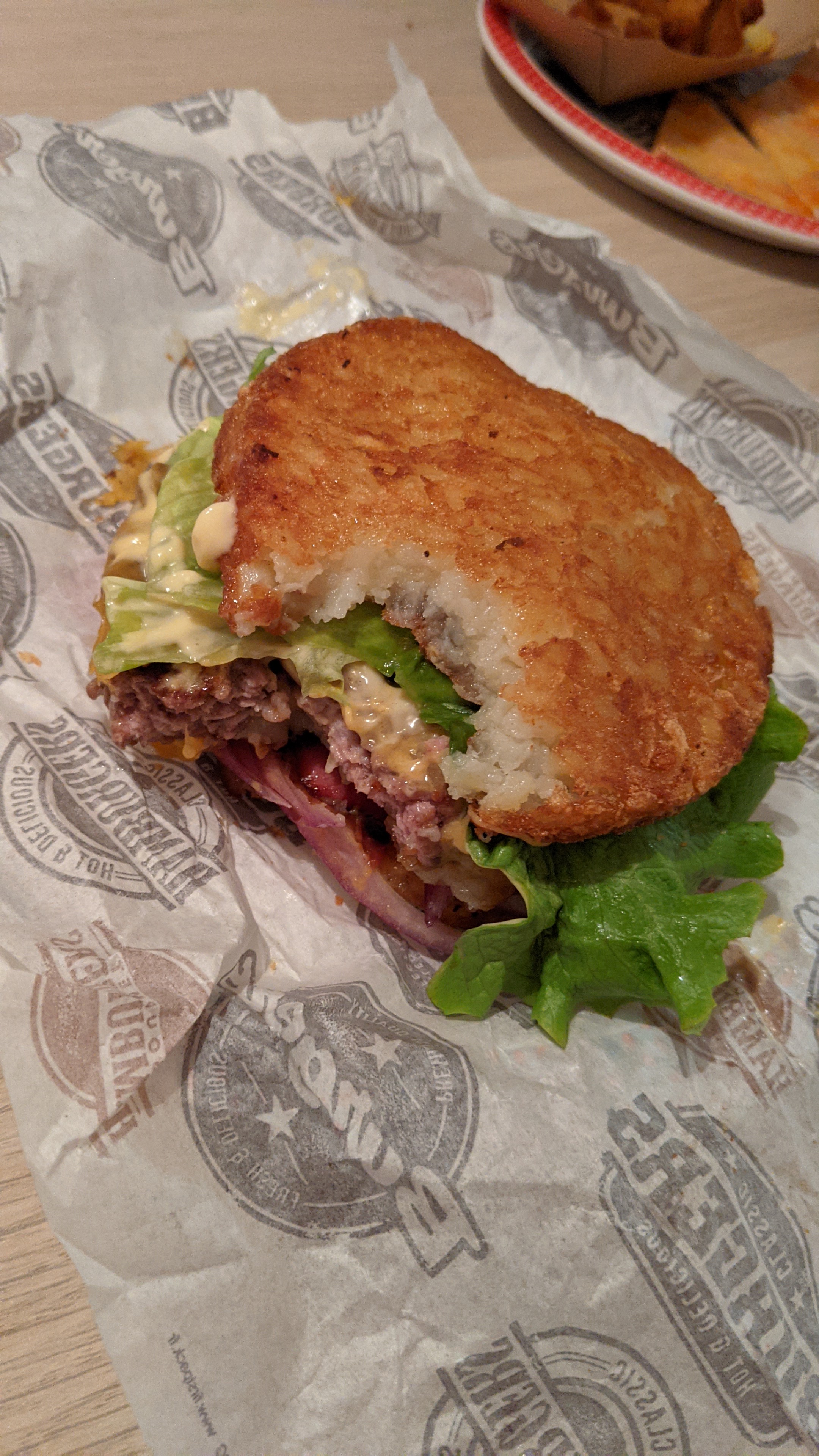 Sans conteste l'un des hamburgers les plus savoureux que j'ai mangé depuis très longtemps. La photo est le burger suprême mais ils l'ont fait sans gluten pour moi en retirant le pain et en utilisant une pomme de terre rissolée supplémentaire à la place ! J'écris cette critique quelques instants après l'avoir mangé parce que c'était vraiment bon. Très copieux et de grande qualité.