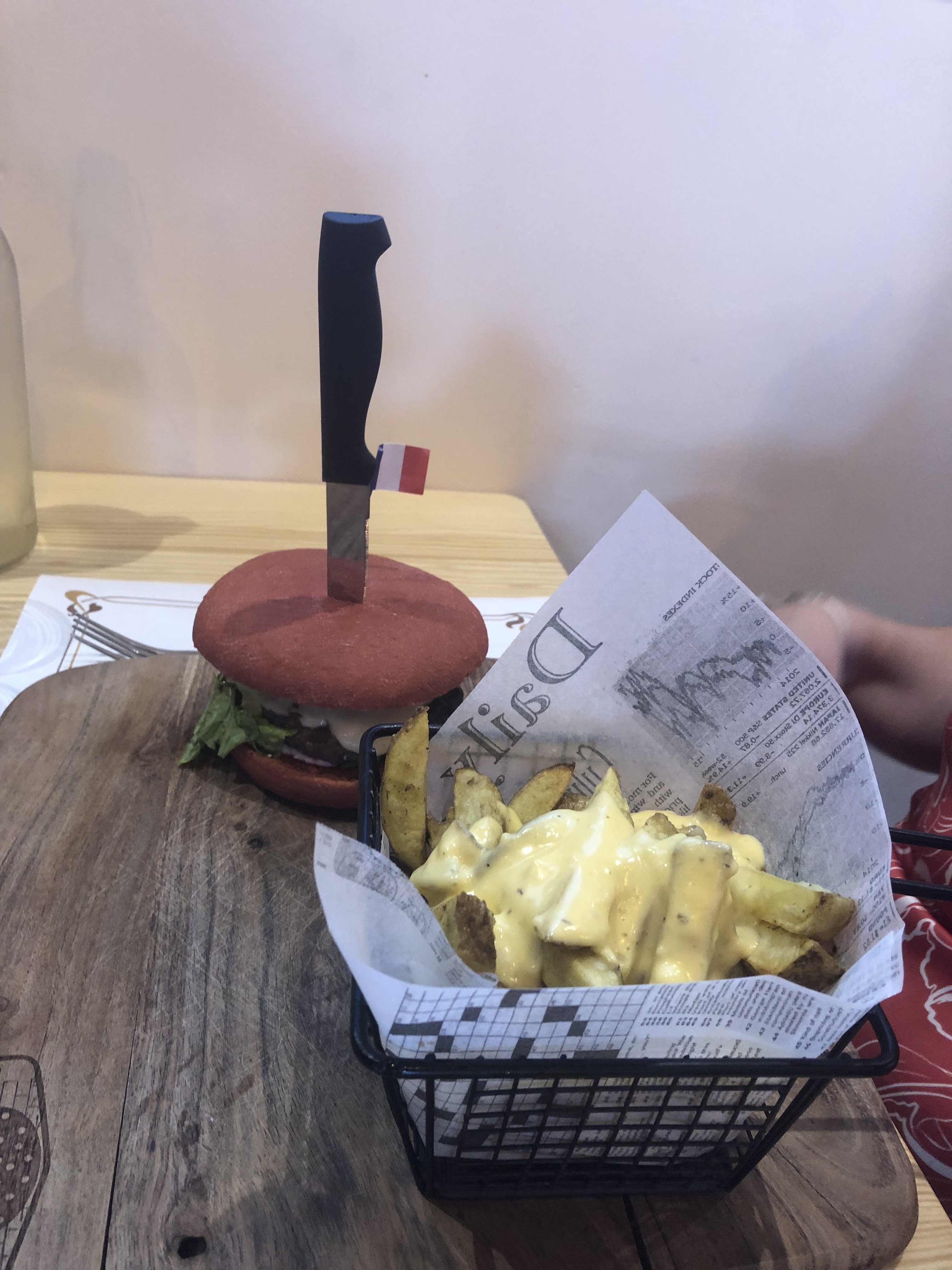Le concept est pas mal, j'aurais aimé manger mon burger à la main et non avec une fourchette et un couteau,c'est le principe du burger,ils ont trop d'étage,les frites avec la peau pas terribles,si non la viande excellente manque juste le goût du grillé,la sauce cheddar écoeurante sur les frites.