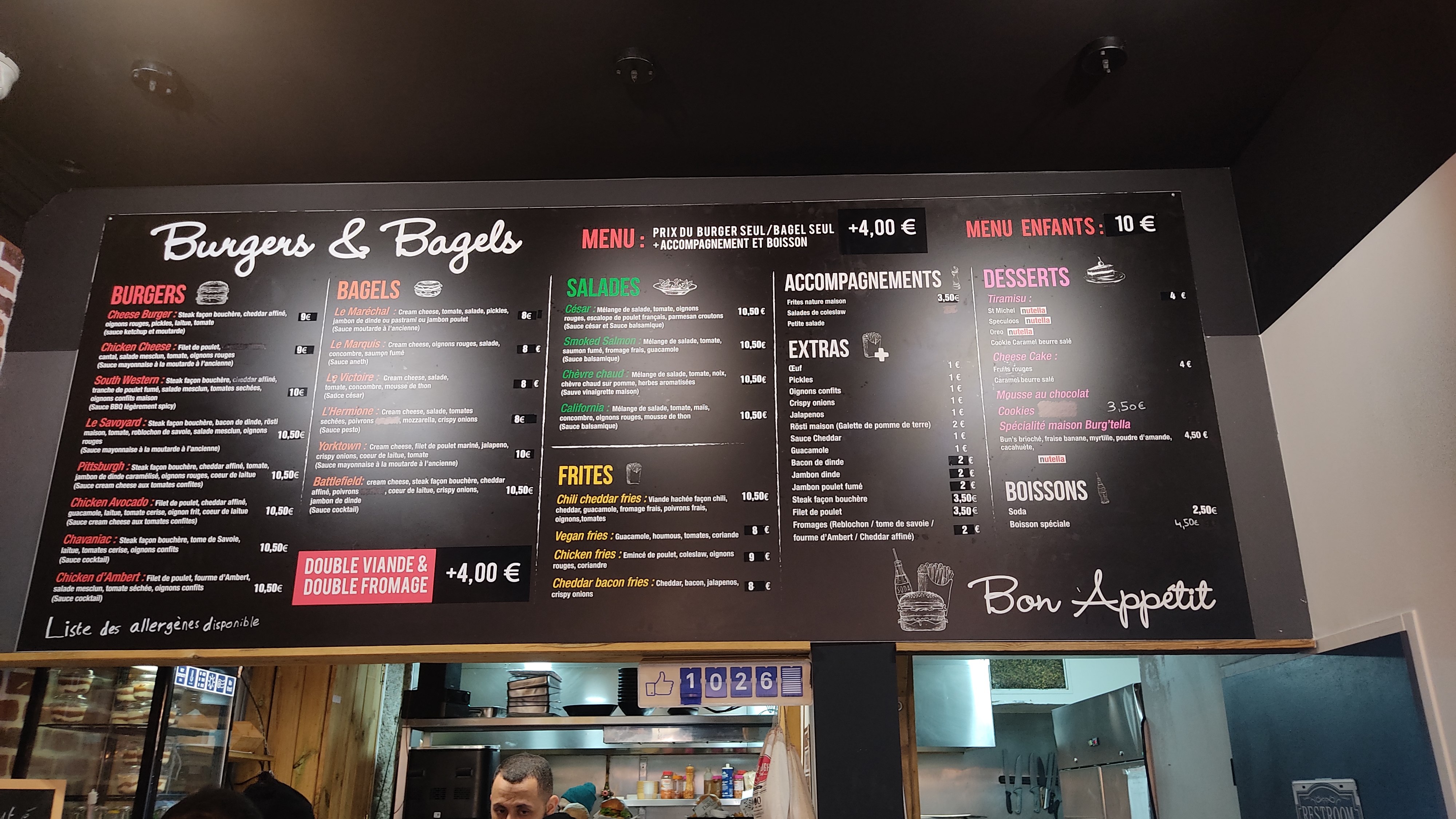 Bagels steak et burger avocado excellent, tout est goûtu, frais ..un régal Points négatifs menu enfant à 10 euros c'est tres cher Frite surgelées mais bon après le reste rattrape Leur tiramissu sablé Nutella, et cookies très bon Tout est très copieux