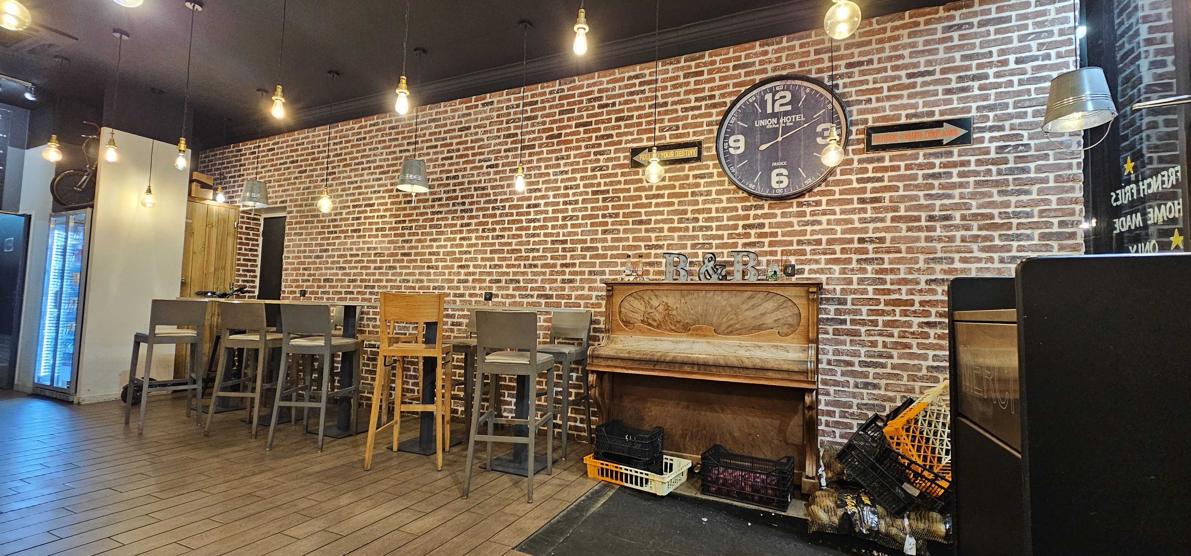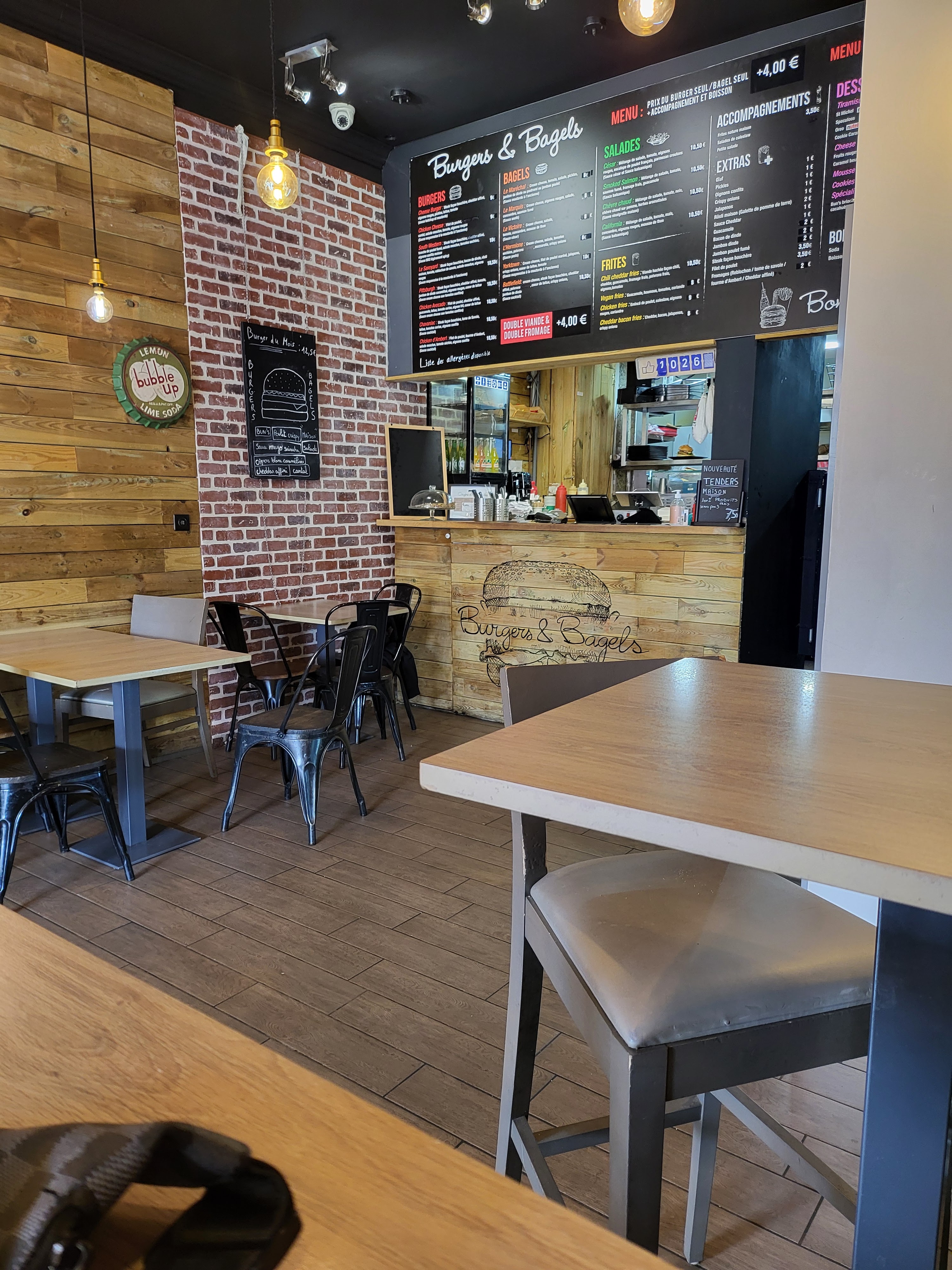 Le serveur qui gérait aussi la caisse a été adorable, beaucoup de gentillesse et accueil parfait. Je suis partie manger avec mes collègues et nous étions très satisfaits. Burgers et bagels très bons !! Je recommande vivement